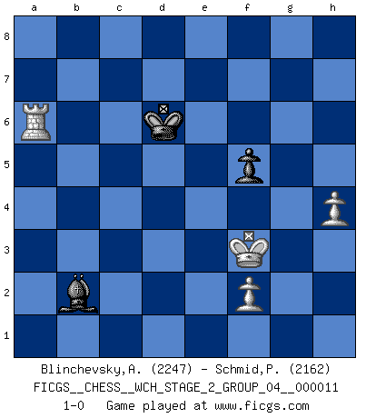 Last move : 1-0 2014 February 10 10:16:47 [Event "FICGS__CHESS__WCH_STAGE_2_GROUP_04__000011"] [Site "FICGS"] [Date "2013.07.30"] [Round "1"] [White "Blinchevsky,Alexander"] [Black "Schmid,Pablo"] [Result "1-0"] [WhiteElo "2247"] [BlackElo "2162"] 1.d4 Nf6 2.c4 g6 3.Nc3 d5 4.Qb3 dxc4 5.Qxc4 Bg7 6.Nf3 O-O 7.e4 Be6 8.Qd3 c5 9.d5 Bg4 10.Be3 Nbd7 11.Nd2 e6 12.d6 e5 13.a4 Be6 14.Be2 a6 15.O-O Ne8 16.b3 Rc8 17.Rfd1 Rc6 18.Nc4 Kh8 19.Qd2 Bxc4 20.bxc4 Rxd6 21.Qb2 Rxd1+ 22.Rxd1 Qc8 23.Bg4 Nef6 24.Bh3 Qc7 25.g3 Rb8 26.Nd5 Nxd5 27.cxd5 Rd8 28.Rb1 Rb8 29.Qd2 Rd8 30.d6 Qc6 31.Qa5 Rc8 32.Bxd7 Qxd7 33.Bxc5 h5 34.Qb6 Kh7 35.a5 h4 36.Be3 Rc6 37.Qxb7 Rxd6 38.Qxd7 Rxd7 39.gxh4 Bh6 40.Bc5 Bd2 41.Rd1 Rd8 42.Bb6 Rd6 43.Kf1 Bb4 44.Rc1 Kg7 45.Rc4 Bd2 46.Ke2 Bf4 47.Rc8 Rd2+ 48.Kf3 f5 49.exf5 gxf5 50.Ra8 Ra2 51.Rxa6 Bxh2 52.Ra8 e4+ 53.Kg2 Bf4 54.a6 e3 55.a7 Kf7 56.Bc5 e2 57.Rf8+ Ke6 58.Re8+ Kd5 59.Rxe2 Ra6 60.Re8 Kxc5 61.a8Q Rxa8 62.Rxa8 Kd6 63.Kf3 Bc1 64.Ra1 Bb2 65.Ra6+ 1-0 King's Indian defense, 3.Nc3 Kingside Castling by player Black (move 6) Kingside Castling by player White (move 15) 10 pieces endgame at move 59 : White KRBPPP , Black KRBP WHITE : King + 1 Rook 1 Bishop 3 Pawns BLACK : King + 1 Rook 1 Bishop 1 Pawn 9 pieces endgame at move 60 : White KRPPP , Black KRBP WHITE : King + 1 Rook 3 Pawns BLACK : King + 1 Rook 1 Bishop 1 Pawn Promotion Queen by player White (move 61) 8 pieces endgame at move 61 : White KRPP , Black KRBP WHITE : King + 1 Rook 2 Pawns BLACK : King + 1 Rook 1 Bishop 1 Pawn 7 pieces endgame at move 62 : White KRPP , Black KBP WHITE : King + 1 Rook 2 Pawns BLACK : King + 1 Bishop 1 Pawn Player White won this chess game. Follow this game move after move (download)I don't believe in psychology. I believe in good moves. (Bobby Fischer) Glücklicherweise sind Großmeister Ruben Fines reine Schachbücher weniger phallozentrisch [als seine Schachpsychologie] und deswegen auch weniger lächerlich. (Nigel Short) Si yo gano un torneo, yo lo gano por mí mismo. Yo hago las jugadas. Nadie me ayuda. (Bobby Fischer) Seul un grand joueur sait à quel point il joue faiblement. (Xavier Tartacover) Men never do evil so completely and cheerfully as when they do it from religious conviction. (Blaise Pascal)