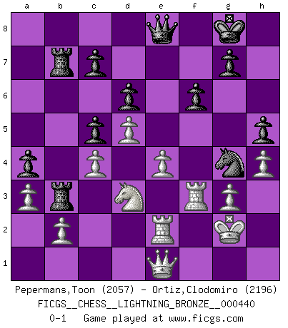 Last move : 0-1 2013 July 30 15:57:51 [Event "FICGS__CHESS__LIGHTNING_BRONZE__000440"] [Site "FICGS"] [Date "2013.07.30"] [Round "1"] [White "Pepermans,Toon"] [Black "Ortiz,Clodomiro"] [Result "0-1"] [WhiteElo "2057"] [BlackElo "2196"] 1.d4 Nf6 2.c4 e6 3.g3 Bb4+ 4.Bd2 a5 5.Bg2 O-O 6.Nf3 b6 7.O-O Bb7 8.Bf4 Be7 9.Nc3 Ne4 10.Nb5 Na6 11.Qc2 d6 12.a3 Rb8 13.d5 Nec5 14.Rad1 e5 15.Be3 a4 16.Nd2 Ra8 17.Nc3 Qd7 18.f4 exf4 19.Bxf4 Rae8 20.e4 Bf6 21.Rde1 Qd8 22.Bh3 Bxc3 23.Qxc3 f6 24.Qc2 Bc8 25.Bxc8 Qxc8 26.Be3 Re7 27.Bd4 h6 28.Rf4 Qe8 29.Kg2 Qd7 30.Re3 Qc8 31.Qd1 Qe8 32.Rh4 Qf7 33.Qg4 Kh7 34.Qd1 Rfe8 35.Rf4 Kg8 36.Qc2 Qh5 37.Rh4 Qg6 38.Qd1 Qf7 39.Rf4 Kh8 40.Rh4 Qg6 41.Rg4 Qh7 42.Rh4 Kg8 43.Rf4 Rf8 44.Rh4 Ra8 45.Rg4 Rf7 46.Rf4 Nb8 47.Bxc5 bxc5 48.Qc2 Nd7 49.Re2 R7f8 50.R4f2 Rfb8 51.Nf3 Rb3 52.Nd2 Rb6 53.Nf3 Qg6 54.Kh1 Qg4 55.Kg2 Rb3 56.Nd2 Rb7 57.Nf3 Nf8 58.Ne1 Rab8 59.Nd3 Ng6 60.h3 Qd7 61.Rf5 Rb3 62.Qd1 Qe8 63.Qd2 Nh8 64.Kh2 Nf7 65.Qc2 h5 66.Qd2 Qd7 67.h4 Qe8 68.Kg2 R8b6 69.Qd1 Nh6 70.Rf3 Ng4 71.Qe1 Rb7 0-1 Catalan Opening Kingside Castling by player Black (move 5) Kingside Castling by player White (move 7) Player Black won this chess game. Follow this game move after move (download)In complicated positions, Bobby Fischer hardly had to be afraid of anybody. (Paul Keres) Wenn du auf das Glück wartest, wird das Leben ziemlich langweilig. (Mikhail Nekhemyevich Tal) De eso se trata el Ajedrez. Un día le das una lección a tu oponente y al día siguiente el te da una a tí. (Bobby Fischer) Demandez au pauvre Cg1 ce qu'il en pense. Eduard Gufeld à propos de la variante Saemisch de l'Est-Indienne. As a goal marker shodan is important. As a destination it is a poor place to stop. (Thomas Tamayo)