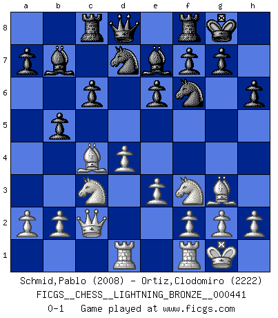 Last move : 0-1 2013 July 30 22:29:51 [Event "FICGS__CHESS__LIGHTNING_BRONZE__000441"] [Site "FICGS"] [Date "2013.07.30"] [Round "1"] [White "Schmid,Pablo"] [Black "Ortiz,Clodomiro"] [Result "0-1"] [WhiteElo "2008"] [BlackElo "2222"] 1.Nf3 d5 2.d4 Nf6 3.c4 c6 4.Nc3 e6 5.Bg5 Nbd7 6.e3 Be7 7.Qc2 O-O 8.Rd1 h6 9.Bh4 b6 10.Bd3 Bb7 11.O-O Rc8 12.Bg3 dxc4 13.Bxc4 b5 0-1 Reti Opening Kingside Castling by player Black (move 7) Kingside Castling by player White (move 11) Player Black won this chess game. Follow this game move after move (download)My style is somewhere between that of Tal and Petrosian. (Reshevsky) Taktik ist was man tun muß, wenn etwas zu tun ist. Strategie ist was man tun muß, wenn nichts zu tun ist. (Savielly Grigorievitsch Tartakower) Peones: ellos son el alma de esta partida, solos forman el ataque y la defensa. (Philidor) Il a essayé de se convaincre qu'il pourrait empêcher toutes les erreurs et ne jamais perdre. L'horreur ! Gary Kasparov au sujet de Robert Fischer. The age of a woman doesn't mean a thing. The best tunes are played on the oldest fiddles. (Ralph Waldo Emerson)