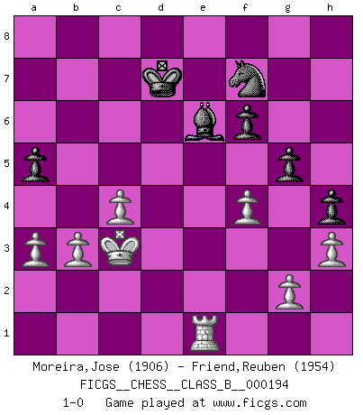 Last move : 1-0 2014 April 14 17:50:11 [Event "FICGS__CHESS__CLASS_B__000194"] [Site "FICGS"] [Date "2013.07.31"] [Round "1"] [White "Moreira,Jose"] [Black "Friend,Reuben"] [Result "1-0"] [WhiteElo "1906"] [BlackElo "1954"] 1.e4 e5 2.Nf3 Nc6 3.Bb5 Nf6 4.O-O Nxe4 5.d4 Be7 6.Qe2 Nd6 7.Bxc6 bxc6 8.dxe5 Nf5 9.Qe4 g6 10.c4 O-O 11.Nc3 Rb8 12.b3 Re8 13.Bb2 Bf8 14.Qc2 d5 15.exd6 Nxd6 16.Na4 Bg7 17.Bxg7 Kxg7 18.Qc3+ Qf6 19.Qxf6+ Kxf6 20.Nd4 Ra8 21.Nxc6 Bd7 22.Nb4 Bxa4 23.Nd5+ Kg7 24.Nxc7 Bc6 25.Nxe8+ Bxe8 26.Rad1 Nb7 27.Rd4 a5 28.Rfd1 Bc6 29.Re1 Kf8 30.f3 Rc8 31.Kf2 Be8 32.Red1 h5 33.R1d2 Rc7 34.h3 Bc6 35.Re2 Bd7 36.Ke3 Be6 37.Kd2 Ke7 38.Rd5 h4 39.Rd4 Rd7 40.Rxd7+ Kxd7 41.Re4 g5 42.Kc3 f6 43.Re1 Nd8 44.a3 Nf7 45.f4 1-0 Ruy Lopez : Open Berlin defense, 5...Be7 Kingside Castling by player White (move 4) Kingside Castling by player Black (move 10) Player White won this chess game. Follow this game move after move (download)Let the perfectionist play postal. (Yasser Seirawan) Wenn Capablanka heute auf der Schachbühne erscheinen würde, hätte er ein halbes Jahr gebraucht um sich die Schachtheorie anzueignen. Und dann hätte er alles und jeden besiegt. (Mikhail Moiseyevich Botvinik) En el Ajedrez, cuando menos, el valiente hereda la tierra. (Edmar Mednis) Aidez vos pièces, elles vous aideront. (Paul Morphy) Beta. Software undergoes beta testing shortly before it's released. Beta is latin for still doesn't work. (Anonymous)