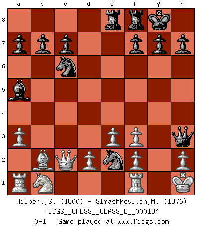Last move : 0-1 2013 September 6 11:36:50 [Event "FICGS__CHESS__CLASS_B__000194"] [Site "FICGS"] [Date "2013.07.31"] [Round "1"] [White "Hilbert,Stephan J."] [Black "Simashkevitch,Mykola"] [Result "0-1"] [WhiteElo "1800"] [BlackElo "1976"] 1.b4 e5 2.Bb2 Bxb4 3.Bxe5 Nf6 4.c4 O-O 5.a3 Nc6 6.Bb2 Ba5 7.Nf3 d5 8.cxd5 Nxd5 9.e3 Qd6 10.Qc2 Bg4 11.Be2 Rae8 12.O-O Nf4 13.Ng5 Nxe2+ 14.Kh1 Qh6 15.Nf3 Bxf3 16.gxf3 Qh3 0-1 Polish (Sokolsky) opening Kingside Castling by player Black (move 4) Kingside Castling by player White (move 12) Player Black won this chess game. Follow this game move after move (download)The passion for playing Chess is one of the most unaccountable in the world. (H.G. Wells) Den Ruhm habe ich schon, jetzt brauche ich noch das Geld. (Wilhelm Steinitz) El Ajedrez es realmente noventa y nueve por ciento calculación. (Soltis) On peut tirer plus d'utilité d'une partie perdue que de 100 parties gagnées. (Capablanca) Man is still the most extraordinary computer of all. (John F. Kennedy)