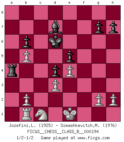 Last move : 1/2-1/2 2014 February 10 12:36:15 [Event "FICGS__CHESS__CLASS_B__000194"] [Site "FICGS"] [Date "2013.07.31"] [Round "1"] [White "Jozefini,Lubor"] [Black "Simashkevitch,Mykola"] [Result "1/2-1/2"] [WhiteElo "1925"] [BlackElo "1976"] 1.e4 e5 2.Nf3 Nc6 3.Bb5 Nf6 4.d3 Bc5 5.Bxc6 dxc6 6.Nbd2 Nd7 7.Nc4 f6 8.Be3 b5 9.Na5 Bb4+ 10.Bd2 Bxa5 11.Bxa5 Nb6 12.Nd2 O-O 13.Bb4 Rf7 14.Nb3 a5 15.Bxa5 c5 16.Bxb6 cxb6 17.Qd2 Be6 18.O-O b4 19.Qe3 Rfa7 20.Nc1 Qd4 21.Qxd4 cxd4 22.Ne2 Bd7 23.f4 Bg4 24.Ng3 Rxa2 25.Rxa2 Rxa2 26.fxe5 fxe5 27.Rb1 Kf7 28.Kf2 b3 29.cxb3 Be6 30.Ne2 Ke7 31.Nc1 Ra8 32.Ke1 Kd6 33.b4 Ra4 34.b5 Bd7 1/2-1/2 Ruy Lopez : Berlin defense Kingside Castling by player Black (move 12) Kingside Castling by player White (move 18) This chess game ended in a draw. Follow this game move after move (download)One bad move nullifies forty good ones. (Horowitz) Sitze auf Deine Hände. (Siegbert Tarrasch) Cuando tengo las piezas blancas, yo gano porque soy blanco; Cuando tengo las piezas negras, yo gano porque soy Bogolyubov. (Bogolyubov) Karpov est une pièce de musée. (Garry Kasparov) Rules and bones are meant to be broken. (Anonymous)