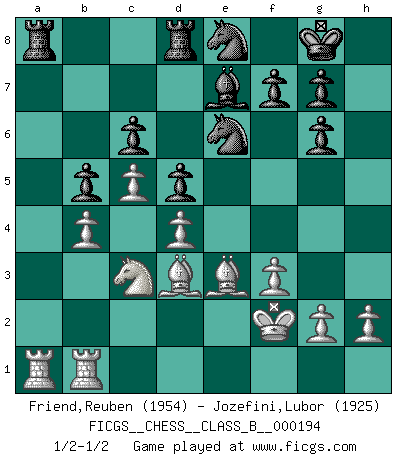 Last move : 1/2-1/2 2014 February 10 12:39:14 [Event "FICGS__CHESS__CLASS_B__000194"] [Site "FICGS"] [Date "2013.07.31"] [Round "1"] [White "Friend,Reuben"] [Black "Jozefini,Lubor"] [Result "1/2-1/2"] [WhiteElo "1954"] [BlackElo "1925"] 1.d4 d5 2.Nf3 Nf6 3.c4 c6 4.e3 Bf5 5.Nc3 e6 6.Nh4 Be4 7.f3 Bg6 8.Qb3 b5 9.c5 Nbd7 10.a4 a6 11.Nxg6 hxg6 12.Qa3 Rc8 13.axb5 axb5 14.Bd3 e5 15.O-O Be7 16.Qa5 O-O 17.b4 Ra8 18.Qxd8 Rfxd8 19.Bd2 exd4 20.exd4 Nf8 21.Kf2 Ne6 22.Be3 Ne8 23.Rfb1 1/2-1/2 Queen's pawn game Kingside Castling by player White (move 15) Kingside Castling by player Black (move 16) This chess game ended in a draw. Follow this game move after move (download)The Pin is mightier than the sword. (Fred Reinfeld) Ich tröste mich mit dem Vergnügen, daß Schachfans, Zuschauer und Leser glücklich sind, wenn ein Großmeister etwas riskiert, statt nur Klötzchen zu schieben. (Mikhail Nekhemyevich Tal) La caracteristica mas importante en la posición del Ajedrez es la actividad de las piezas. Esto es absolutamente fundamental en todas las fases del juego: Apertura, Juego Medio y especialmente Finales. La limitación primordial en la actividad de una pieza, es la estructuración de los Peones. (Michael Stean) Assurément je connaissais par expérience le mystérieux attrait de ce jeu royal, le seul entre tous les jeux inventés par les hommes qui échappe souverainement à la tyrannie du hasard, le seul où l'on ne doive sa victoire qu'à son intelligence ou plutôt à une certaine forme d'intelligence. Mais n'est-ce pas déjà le limiter injurieusement que d'appeler les échecs un jeu ? N'est-ce pas une science, un art ou quelque chose qui, comme le cercueil de Mahomet entre ciel et terre, est suspendu entre l'un et l'autre, et qui réunit un nombre incroyable de contraires ? [...] C'est une pensée qui ne mène à rien, une mathématique qui n'établit rien, un art qui ne laisse pas d'uvre, une architecture sans matière; et il l'a prouvé néanmoins qu'il était plus durable, à sa manière, que les livres ou que tout autre monument, ce jeu unique qui appartient à tous les peuples et à tous les temps, et dont personne ne sait quel dieu en fit don à la terre pour tuer l'ennui, pour aiguiser l'esprit et stimuler l'âme. Où commence-t-il, où finit-il ? (Stefan Zweig) The Internet is the first thing that humanity has build that humanity doesn't understand, the largest experiment in anarchy that we have ever had. (Eric Schmidt)