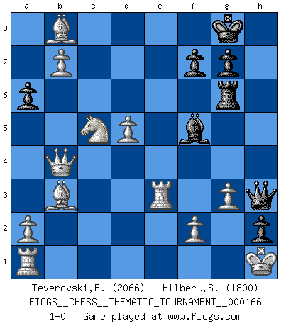 Last move : 1-0 2013 October 24 20:22:22 [Event "FICGS__CHESS__THEMATIC_TOURNAMENT__000166"] [Site "FICGS"] [Date "2013.08.01"] [Round "1"] [White "Teverovski,Bogoljub"] [Black "Hilbert,Stephan J."] [Result "1-0"] [WhiteElo "2066"] [BlackElo "1800"] 1.e4 e5 2.Nf3 Nc6 3.Bc4 Bc5 4.b4 d5 5.exd5 Nxb4 6.O-O Nf6 7.Nxe5 Nbxd5 8.d4 Be7 9.Bb5+ Kf8 10.c4 a6 11.Ba4 Nb6 12.Bb3 c5 13.d5 h5 14.Nd2 Ng4 15.Nef3 Bd6 16.Ne4 Bxh2+ 17.Nxh2 Nxh2 18.Re1 Ng4 19.Bf4 Bf5 20.Nxc5 Rh6 21.Nxb7 Qh4 22.Qd2 Rg6 23.c5 Nf6 24.cxb6 Ne4 25.Qb4+ Kg8 26.Rxe4 Qg4 27.g3 h4 28.Re3 h3 29.Nc5 Rb8 30.b7 h2+ 31.Kh1 Qh3 32.Bxb8 1-0 Evans counter-gambit Kingside Castling by player White (move 6) Player White won this chess game. Follow this game move after move (download)Chess is everything: art, science and sport. (Anatoly Karpov) Darum geht es im Schach. Einen Tag gibst du deinem Gegner eine Lektion, am nächsten Tag gibt er dir eine. (Robert James Fischer) El Ajedrez es una guerra en un tablero. El objetivo es aplastar la mente del oponente. (Bobby Fischer) Nous sommes les pions de la mystérieuse partie d'Echecs jouée par Dieu. Il nous déplace, nous arrête, nous pousse encore, puis nous lance un à un dans la boîte du Néant. Epitaphe sur la tombe de David Janowsky (1868-1927). They misunderestimated me. (George W. Bush, Bentonville nov. 6, 2000)