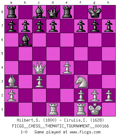 Last move : 1-0 2013 December 19 9:42:15 [Event "FICGS__CHESS__THEMATIC_TOURNAMENT__000166"] [Site "FICGS"] [Date "2013.08.01"] [Round "1"] [White "Hilbert,Stephan J."] [Black "Cirulis,Ilmars"] [Result "1-0"] [WhiteElo "1800"] [BlackElo "1628"] 1.e4 e5 2.Nf3 Nc6 3.Bc4 Bc5 4.b4 Bxb4 5.c3 Ba5 6.Qb3 Nh6 7.O-O O-O 8.d4 Bb6 9.dxe5 Ng4 10.Ba3 Na5 11.Qa4 Nxc4 12.Qxc4 Re8 13.Nbd2 Nxe5 14.Nxe5 Rxe5 15.Nf3 Re8 16.Rad1 1-0 Evans gambit Kingside Castling by player White (move 7) Kingside Castling by player Black (move 7) Player White won this chess game. Follow this game move after move (download)You are for me the Queen on d8 and I am the Pawn on d7 !! (Eduard Gufeld) Charakterschwächen offenbaren sich normalerweise während einer Schachpartie. (Garry Kasparov) No hay precio que sea tan grande por la cabellera del Rey enemigo. (Koblentz) Shah mat. Le roi est mort. Cri de fierté d'un joueur venant de terrasser son adversaire, courtoisement, sans effusion de sang. Men should grow up. - Yeah. And dogs should stop licking themselves. It's not gonna happen. (Gregory House to Dr. Cameron, House M.D.)