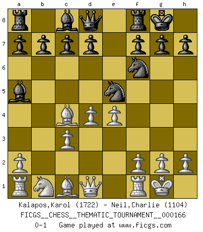Last move : 0-1 2013 September 24 2:45:27 [Event "FICGS__CHESS__THEMATIC_TOURNAMENT__000166"] [Site "FICGS"] [Date "2013.08.01"] [Round "1"] [White "Kalapos,Karol"] [Black "Neil,Charlie"] [Result "0-1"] [WhiteElo "1722"] [BlackElo "1104"] 1.e4 e5 2.Nf3 Nc6 3.Bc4 Bc5 4.b4 Bxb4 5.c3 Ba5 6.O-O Nf6 7.d4 O-O 8.Nxe5 Nxe5 0-1 This chess game has been lost on time (started : 2013.08.01 15:19:41) Evans gambit Kingside Castling by player White (move 6) Kingside Castling by player Black (move 7) Player Black won this chess game. Follow this game move after move (download)I look one move ahead... the best ! (Siegbert Tarrasch) Ich möchte Schüler heranbilden, die das Vermögen haben, selbst zu denken und Kritik zu üben. (Emanuel Lasker) El Rey es una pieza de pelea. ¡Usenlo!. (Wilhelm Steinitz) Une platitude souvent récitée à propos des Echecs est qu'une des choses les plus difficiles à réaliser est de gagner une position gagnante. Cela ne manque pas de sens mais, pour ma part, j'ai toujours trouvé plus difficile de gagner une position perdante. (Tim Krabbe) Wipe them out. All of them. (Darth Sidious in Star Wars ep.1)