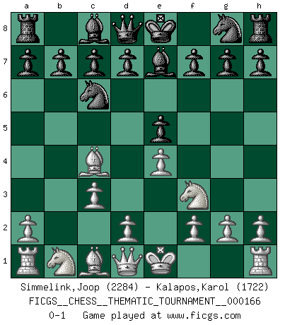 Last move : 0-1 2013 September 13 0:5:25 [Event "FICGS__CHESS__THEMATIC_TOURNAMENT__000166"] [Site "FICGS"] [Date "2013.08.01"] [Round "1"] [White "Simmelink,Joop"] [Black "Kalapos,Karol"] [Result "0-1"] [WhiteElo "2284"] [BlackElo "1722"] 1.e4 e5 2.Nf3 Nc6 3.Bc4 Bc5 4.b4 Bxb4 5.c3 Be7 0-1 Evans gambit : 5...Be7 Player Black won this chess game. Follow this game move after move (download)Before the endgame, the Gods have placed the middle game. (Siegbert Tarrasch) Bobby Fischer ist kein Vorbild für die heutige Jugend. (Viktor Kortschnoi) El Ajedrez demanda una total concentración. (Bobby Fischer) Tout change constamment, y compris dans le monde des Echecs. (Botvinnik) I can't decide which is riskier; taking crazy risks, or taking advice on crazy risks from a crazy risk taker. (Gregory House in House M.D.)