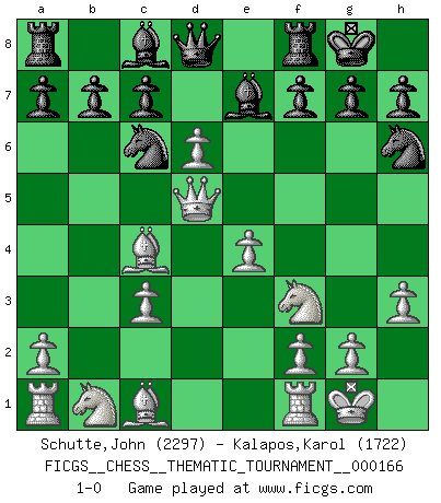 Last move : 1-0 2013 November 3 17:59:23 [Event "FICGS__CHESS__THEMATIC_TOURNAMENT__000166"] [Site "FICGS"] [Date "2013.08.01"] [Round "1"] [White "Schutte,John"] [Black "Kalapos,Karol"] [Result "1-0"] [WhiteElo "2297"] [BlackElo "1722"] 1.e4 e5 2.Nf3 Nc6 3.Bc4 Bc5 4.b4 Bxb4 5.c3 Be7 6.d4 Nf6 7.dxe5 Ng4 8.Qd5 O-O 9.h3 Nh6 10.O-O d6 11.exd6 1-0 This chess game has been lost on time (started : 2013.08.01 15:19:41) Evans gambit : 5...Be7 Kingside Castling by player Black (move 8) Kingside Castling by player White (move 10) Player White won this chess game. Follow this game move after move (download)Chess is really ninety nine percent calculation. (Soltis) Im Schach gibt es keinen Platz für Galanterie. (Irving Chernev) Alekhine es un poeta que crea un trabajo de arte de algo que raramente inspiraría a otra persona a mandar una tarjeta postal. (Max Euwe) La solitude du joueur d'Echecs à l'approche du mat est semblable à celle du condamné. (Francis Szpiner) Programming can only do so much before it becomes too much. (Don Groves)
