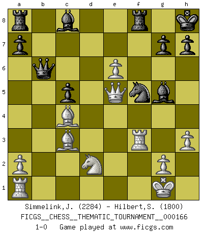 Last move : 1-0 2013 October 3 23:32:35 [Event "FICGS__CHESS__THEMATIC_TOURNAMENT__000166"] [Site "FICGS"] [Date "2013.08.01"] [Round "1"] [White "Simmelink,Joop"] [Black "Hilbert,Stephan J."] [Result "1-0"] [WhiteElo "2284"] [BlackElo "1800"] 1.e4 e5 2.Nf3 Nc6 3.Bc4 Bc5 4.b4 d5 5.exd5 Nxb4 6.O-O Nf6 7.Nxe5 Nbxd5 8.d4 Be7 9.Bb3 O-O 10.c4 Nb6 11.Bb2 Nbd7 12.f4 Nxe5 13.fxe5 Ng4 14.Rf3 c5 15.d5 Bg5 16.Qe1 b5 17.h3 bxc4 18.Bxc4 Qb6 19.Bc3 Nh6 20.Nd2 Nf5 21.e6 fxe6 22.dxe6 Kh8 23.Qe5 1-0 Joop Simmelink thanks for the game! Evans counter-gambit Kingside Castling by player White (move 6) Kingside Castling by player Black (move 9) Player White won this chess game. Follow this game move after move (download)When you don't know what to play, wait for an idea to come into your opponent's mind. You may be sure that idea will be wrong. (Siegbert Tarrasch) Du kannst im Schach nur gut werden, wenn du das Spiel liebst. (Robert James Fischer) Hasta este punto, las blancas han seguido un análisis bien conocido. Pero ahora el hace un error fatal: empieza a usar su propia cabeza. (Siegbert Tarrasch) Pour moi, les échecs ne sont pas un jeu mais un art. (Alexandre Alekhine) The difference between perseverance and obstinacy is that one comes from a strong will, and the other from a strong won't. (Henry Ward Beecher)