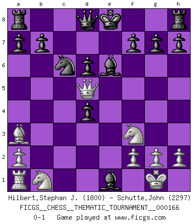 Last move : 0-1 2013 October 2 14:9:4 [Event "FICGS__CHESS__THEMATIC_TOURNAMENT__000166"] [Site "FICGS"] [Date "2013.08.01"] [Round "1"] [White "Hilbert,Stephan J."] [Black "Schutte,John"] [Result "0-1"] [WhiteElo "1800"] [BlackElo "2297"] 1.e4 e5 2.Nf3 Nc6 3.Bc4 Bc5 4.b4 Bxb4 5.c3 Ba5 6.d4 exd4 7.O-O Nf6 8.Ba3 d6 9.e5 Ne4 10.exd6 cxd6 11.Bd5 Nxc3 12.Re1+ Be6 13.Qb3 Nxd5 14.Qxd5 Bxe1 0-1 Evans gambit Kingside Castling by player White (move 7) Player Black won this chess game. Follow this game move after move (download)Your body has to be in top condition. Your Chess deteriorates as your body does. You can't separate body from mind. (Bobby Fischer) Mit Schach schule ich mein Gefühl für Geometrie, was für Tennis und Schach gleichermaßen wichtig ist. (Boris Becker) Nos gusta pensar. (Gary Kasparov) Les Cavaliers se révèlent fort utiles dans les positions fermées. D'habitude, les Fous sont un peu plus forts que les Cavaliers dans les positions ouvertes. Qu'on le veuille ou non, il restera toujours des exceptions ! I find television to be very educating. Every time somebody turns on the set, I go in the other room and read a book. (Groucho Marx)