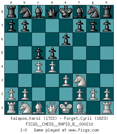 Last move : 1-0 2013 September 23 2:36:59 [Event "FICGS__CHESS__RAPID_B__000210"] [Site "FICGS"] [Date "2013.08.04"] [Round "1"] [White "Kalapos,Karol"] [Black "Forget,Cyril"] [Result "1-0"] [WhiteElo "1722"] [BlackElo "1823"] 1.d4 d5 2.c4 e6 3.e3 c5 4.Nf3 1-0 This chess game has been lost on time (started : 2013.08.04 11:48:44) Queen's gambit declined Player White won this chess game. Follow this game move after move (download)I thought the most common mistake [in chess] was the first one: Learning the game :P (Garvin Gray, FICGS forum) Wie, soll nun auch die Opposition abgeschafft werden? Ja, es tut mir leid, Ihnen diesen Schmerz nicht ersparen zu können. (Aaron Nimzowitsch) Cuando tu casa esta en llamas, no puedes ser molestado por tus vecinos. O, como decinos en Ajedrez, si tu Rey esta bajo ataque, no te preocupa perder un Peón del lado de la Reina. (Gary Kasparov) A chaque perte on perd un peu de soi. (Joël Lautier) If only faces could talk... (Pat Summerall, Sportscaster during the Super Bowl)