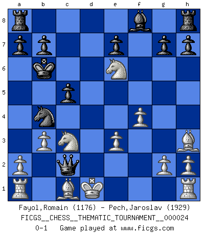Last move : 0-1 2007 April 17 2:0:55 [Event "FICGS__CHESS__THEMATIC_TOURNAMENT__000024"] [Site "FICGS"] [Date "2007.02.05"] [Round "1"] [White "Fayol,Romain"] [Black "Pech,Jaroslav"] [Result "0-1"] [WhiteElo "1176"] [BlackElo "1929"] 1.e4 c5 2.f4 d5 3.Nf3 dxe4 4.Ng5 Nf6 5.Bc4 Bg4 6.Bxf7+ Kd7 7.Qxg4+ Nxg4 8.Be6+ Kc7 9.Bxg4 Qe8 10.Ne6+ Kb6 11.Nc3 Na6 12.b3 Nb4 13.Kd1 Qg6 14.Bh3 e3 15.dxe3 Qxc2+ 0-1 Sicilian : Grand Prix attack Player Black won this chess game. Follow this game move after move (download)My God, Bobby Fischer plays so simply. (Alexei Suetin) Ich glaube, ich kenne inzwischen die Gründe für mein Versagen: schachliche Charakterfehler. Ich war nie ein Wunderkind und in meiner gesamten menschlichen Entwicklung immer zu langsam. (Viktor Kortschnoi) El Ajedrez es de 30 a 40 por ciento psicología. Uno no cuenta con esto cuando se juega contra una computadora. No lo puedo confundir. (Judith Polgar) Donnez-moi un Cavalier en 6e et je gagnerais toutes mes parties. (Steinitz) Fortune favours the audacious. (Desiderius Erasmus)
