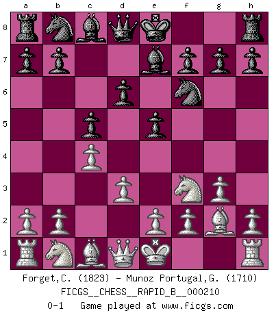 Last move : 0-1 2013 September 18 2:24:29 [Event "FICGS__CHESS__RAPID_B__000210"] [Site "FICGS"] [Date "2013.08.04"] [Round "1"] [White "Forget,Cyril"] [Black "Munoz Portugal,Guillermo"] [Result "0-1"] [WhiteElo "1823"] [BlackElo "1710"] 1.Nf3 Nf6 2.c4 c5 3.g3 d6 4.Bg2 e5 5.d3 Be7 0-1 This chess game has been lost on time (started : 2013.08.04 11:48:44) Reti Opening Player Black won this chess game. Follow this game move after move (download)A man that will take back a move at Chess will pick a pocket. (Richard Fenton) Als ich elf wurde, wurde ich einfach gut. (Robert James Fischer) El Ajedrez, como la música, como el amor, tiene el poder de hacer feliz a la gente. (Siegbert Tarrasch) Les échecs sont un jeu terrible. Si vous n'avez pas le centre, votre adversaire a une position plus libre. Par contre, si vous avez le centre, alors vous avez vraiment quelque chose pour laquelle vous inquiéter ! (Siegbert Tarrasch) Without enthusiasm, virtue functions not at all, and vice only poorly. (Mignon McLaughlin, The Neurotic's Notebook, 1960)
