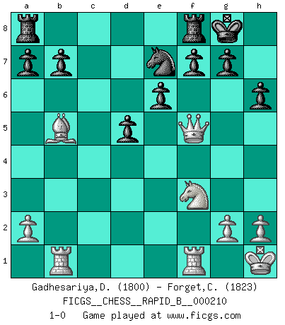 Last move : 1-0 2013 October 2 15:16:20 [Event "FICGS__CHESS__RAPID_B__000210"] [Site "FICGS"] [Date "2013.08.04"] [Round "1"] [White "Gadhesariya,Divyesh"] [Black "Forget,Cyril"] [Result "1-0"] [WhiteElo "1800"] [BlackElo "1823"] 1.e4 c6 2.d4 d5 3.e5 c5 4.c3 Nc6 5.Nf3 Bg4 6.Be2 e6 7.Bg5 Qb6 8.dxc5 Qxb2 9.Nbd2 Qxc3 10.O-O Bxc5 11.Rc1 Qa3 12.Rb1 Bb6 13.Bb5 h6 14.Be3 Bxe3 15.fxe3 Qxe3+ 16.Kh1 Nge7 17.Qa4 O-O 18.Qxg4 Nxe5 19.Nxe5 Qxe5 20.Nf3 Qf5 21.Qxf5 1-0 This chess game has been lost on time (started : 2013.08.04 11:48:44) Caro-Kann : Advance variation Kingside Castling by player White (move 10) Kingside Castling by player Black (move 17) Player White won this chess game. Follow this game move after move (download)Avoid the crowd. Do your own thinking independently. Be the Chess player, not the Chess piece. (Ralph Charell) Deine Wertungszahl - vorausgesetzt einige Jahre schachliche Anstrengung - entspricht etwa dem zehnfachen Deines IQ plus 1000. (Jonathan Levitt) Hoy en día, si tu no eres un Gran Maestro a los 14 años, es mejor que lo olvides. (Anand Viswanathan) Horreur, mais aussi harmonie suprême : qu'y avait-il en effet au monde en dehors des échecs ? Le brouillard, l'inconnu, le non-être... (Vladimir Nabokov) Those who make the worst use of their time are the first to complain of its brevity. (Jean de la Bruyere)