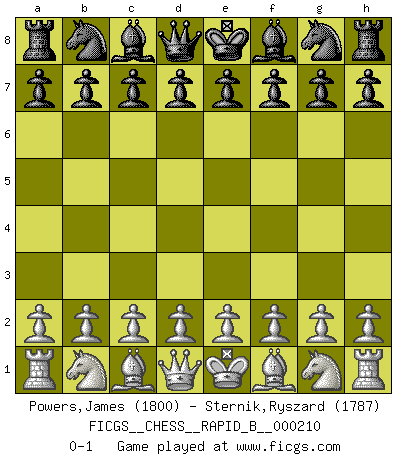 Last move : 0-1 2013 September 3 13:15:43 [Event "FICGS__CHESS__RAPID_B__000210"] [Site "FICGS"] [Date "2013.08.04"] [Round "1"] [White "Powers,James"] [Black "Sternik,Ryszard"] [Result "0-1"] [WhiteElo "1800"] [BlackElo "1787"] 0-1 This chess game has been lost on time (started : 2013.08.04 11:48:44) Player Black won this chess game. Follow this game move after move (download)What is the difference between chess and football? Everybody understands football, but nobody plays it. Everybody plays chess, but nobody understands it. Everything is relative. (Vladimir Kramnik) Du musst Deinen Gegner in einen tiefen dunklen Wald führen wo 2+2=5 ist und wo der Weg, der wieder hinausführt, nur breit genug für einen ist. (Mikhail Nekhemyevich Tal) Cuando estes solo, cuando te sientas un extraño en el mundo, juega al Ajedrez. Esto levantará tu espiritu y será tu consejero de guerra. (Aristóteles) On est toujours la mazette de quelqu'un d'autre. (Anonyme) Wipe them out. All of them. (Darth Sidious in Star Wars ep.1)