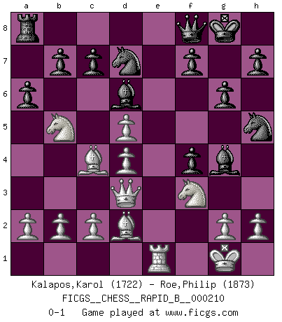 Last move : 0-1 2013 September 20 14:31:52 [Event "FICGS__CHESS__RAPID_B__000210"] [Site "FICGS"] [Date "2013.08.04"] [Round "1"] [White "Kalapos,Karol"] [Black "Roe,Philip"] [Result "0-1"] [WhiteElo "1722"] [BlackElo "1873"] 1.e4 e5 2.f4 d5 3.exd5 exf4 4.Nf3 Nf6 5.Bc4 Bd6 6.O-O O-O 7.Nc3 Bg4 8.d4 Nbd7 9.Qd3 Re8 10.Bd2 Nh5 11.Rae1 g6 12.Rxe8+ Qxe8 13.Re1 Qf8 14.Nb5 a6 0-1 This chess game has been lost on time (started : 2013.08.04 11:48:44) KGD : Falkbeer counter-gambit Kingside Castling by player White (move 6) Kingside Castling by player Black (move 6) Player Black won this chess game. Follow this game move after move (download)It's just you and your opponent at the board and you're trying to prove something. (Bobby Fischer) Wer sich die Fähigkeit anerziehen will im Schach selbstständig zu denken, der muß alles meiden, was leblos ist: ausgeklügelte Theorien, die sich auf sehr wenige Beispiele und eine Menge Hirngespinste stützen. (Emanuel Lasker) Los asuntos humanos son como una partida de Ajedrez: solo aquellos que no lo toman seriamente, pueden ser llamados buenos jugadores. (Hung Tzu Ch'eng) La solitude du joueur d'Echecs à l'approche du mat est semblable à celle du condamné. (Francis Szpiner) Plans are ideas that never come to fruition. (Daniel Parmet)