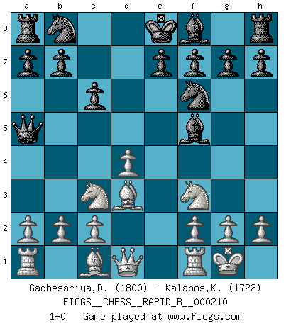Last move : 1-0 2013 September 24 2:45:27 [Event "FICGS__CHESS__RAPID_B__000210"] [Site "FICGS"] [Date "2013.08.04"] [Round "1"] [White "Gadhesariya,Divyesh"] [Black "Kalapos,Karol"] [Result "1-0"] [WhiteElo "1800"] [BlackElo "1722"] 1.e4 d5 2.exd5 Qxd5 3.Nc3 Qa5 4.Nf3 Nf6 5.d4 c6 6.Bd3 Bf5 7.O-O 1-0 This chess game has been lost on time (started : 2013.08.04 11:48:44) Scandinavian (centre counter) defense Kingside Castling by player White (move 7) Player White won this chess game. Follow this game move after move (download)One bad move nullifies forty good ones. (Horowitz) Wer der Ansicht ist, daß alle Schachspieler verrückt sind, wird durch Studium des Lebens von Emil Josef Diemer nicht auf andere Gedanken kommen. (Hans Ree) En la vida, como en el Ajedrez, los Peones propios obstruyen nuestro camino. La gran fortuna de un hombre, su comodidad, placer, hijos, libros, que deberían ayudarle a ganar, con mucha frecuencia lo ponen en Jaque Mate. (Charles Buxton) La tactique, c'est ce que vous faites quand il y a quelque chose à faire; la stratégie, c'est ce que vous faites quand il n'y a rien à faire. (Savielli Tartacower) I don't believe in psychology. I believe in good moves. (Bobby Fischer)