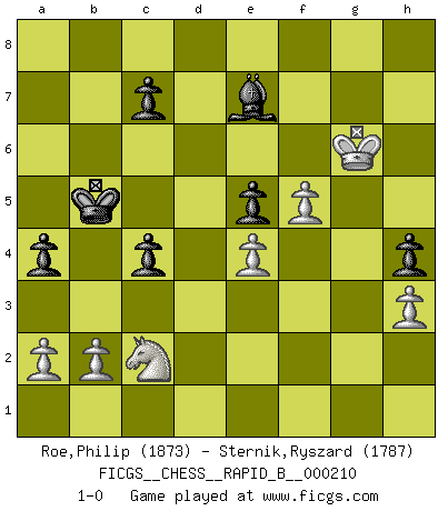 Last move : 1-0 2013 September 23 16:37:58 [Event "FICGS__CHESS__RAPID_B__000210"] [Site "FICGS"] [Date "2013.08.04"] [Round "1"] [White "Roe,Philip"] [Black "Sternik,Ryszard"] [Result "1-0"] [WhiteElo "1873"] [BlackElo "1787"] 1.e4 e5 2.Nf3 Nc6 3.Bb5 a6 4.Bxc6 dxc6 5.O-O Bg4 6.h3 h5 7.d3 Qf6 8.Nbd2 g5 9.Nc4 Bxf3 10.Qxf3 Qxf3 11.gxf3 f6 12.Be3 Ne7 13.d4 Ng6 14.dxe5 b5 15.Na5 Nxe5 16.f4 gxf4 17.Bxf4 Rg8+ 18.Kh1 Kd7 19.Rad1+ Bd6 20.Bxe5 fxe5 21.f4 Rae8 22.f5 Rg3 23.Kh2 h4 24.Rg1 Reg8 25.Rxg3 Rxg3 26.Rd3 Rxd3 27.cxd3 Bb4 28.Nb3 a5 29.Kg2 a4 30.Na1 Be7 31.Nc2 c5 32.Kf3 Kc6 33.Kg4 c4 34.dxc4 bxc4 35.Kh5 Kb5 36.Kg6 1-0 Ruy Lopez : Exchange variation, Alapin gambit Kingside Castling by player White (move 5) Player White won this chess game. Follow this game move after move (download)The Pin is mightier than the sword. (Fred Reinfeld) Wer nie einen Fehler gemacht hat, hat nie etwas Neues ausprobiert. (Albert Einstein) El Ajedrez es un juego de pelea el cual es puramente intelectual e incluye la suerte. (Richard Reti) Il n'y a pas de prix trop élevé au scalp de l'ennemi. (Koblentz) Difficult things take a long time, impossible things a little longer. (Author unknown)