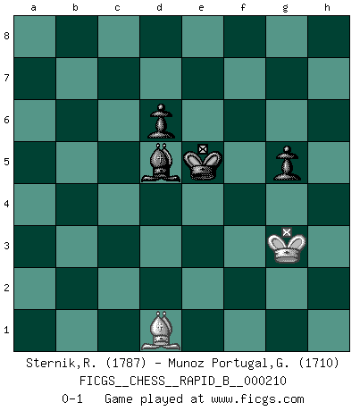 Last move : 0-1 2013 November 7 13:28:1 [Event "FICGS__CHESS__RAPID_B__000210"] [Site "FICGS"] [Date "2013.08.04"] [Round "1"] [White "Sternik,Ryszard"] [Black "Munoz Portugal,Guillermo"] [Result "0-1"] [WhiteElo "1787"] [BlackElo "1710"] 1.e4 e5 2.Nf3 d6 3.d4 exd4 4.Nxd4 Be7 5.Be2 Nf6 6.Nc3 O-O 7.O-O Re8 8.f4 Bf8 9.Bf3 c5 10.Ndb5 Nc6 11.Be3 a6 12.Na3 Rb8 13.Bf2 Nd4 14.Bxd4 cxd4 15.Qxd4 b5 16.Nd5 Nxd5 17.exd5 g6 18.Qa7 Bf5 19.Rad1 Bh6 20.g3 Bg7 21.c3 b4 22.cxb4 Bxb2 23.Nc4 Rxb4 24.Nxb2 Rxb2 25.Qxa6 Qc7 26.Rc1 Qb8 27.Qa5 Bd3 28.Rfe1 Rxe1 29.Qxe1 Qa7 30.Kh1 Qxa2 31.g4 Rxh2 32.Kg1 Rc2 33.Rxc2 Qxc2 34.Qb4 h6 35.Bg2 Qb1 36.Qxb1 Bxb1 37.Kf2 g5 38.Kg3 Kg7 39.Bf3 f5 40.gxf5 Bxf5 41.Bg2 Bc2 42.Bf3 Kf6 43.Bg2 Bf5 44.Bf3 Bd3 45.Bg2 Bg6 46.Bf3 Kf5 47.Bg4+ Ke4 48.Bf3+ Ke3 49.fxg5 hxg5 50.Bg2 Bf5 51.Bf3 Kd4 52.Bg2 Ke5 53.Bf3 Be4 54.Bd1 Bxd5 0-1 Philidor : Exchange variation Kingside Castling by player Black (move 6) Kingside Castling by player White (move 7) 10 pieces endgame at move 40 : White KBPPP , Black KBPPP WHITE : King + 1 Bishop 3 Pawns BLACK : King + 1 Bishop 3 Pawns 9 pieces endgame at move 40 : White KBPP , Black KBPPP WHITE : King + 1 Bishop 2 Pawns BLACK : King + 1 Bishop 3 Pawns 8 pieces endgame at move 49 : White KBPP , Black KBPP WHITE : King + 1 Bishop 2 Pawns BLACK : King + 1 Bishop 2 Pawns 7 pieces endgame at move 49 : White KBP , Black KBPP WHITE : King + 1 Bishop 1 Pawn BLACK : King + 1 Bishop 2 Pawns 6 pieces endgame at move 54 : White KB , Black KBPP WHITE : King + 1 Bishop BLACK : King + 1 Bishop 2 Pawns Player Black won this chess game. Follow this game move after move (download)Chess opens and enriches your mind. (Saudin Robovic) Wenn es im Universum noch irgendwo intelligente Lebewesen gibt, dann kennen sie Go. (Emanuel Lasker) Personalmente, yo prefiero mirar hacia el futuro en donde un programa de computadora gane el título mundial de Ajedrez. La humanidad necesita una lección de humildad. (Richard Dawkings) Je ne crois pas en la psychologie, je crois aux bons coups. (Robert Fischer) A belief is an idea the mind possesses, an idea that possesses the mind. (Robert Oxden Bolton)