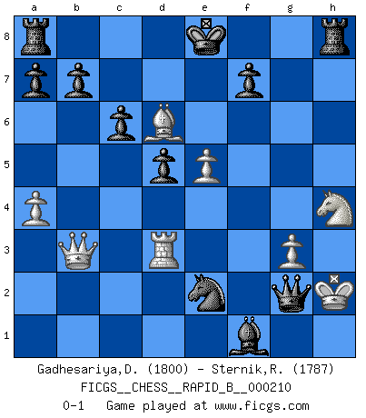 Last move : 0-1 2013 August 13 13:50:56 [Event "FICGS__CHESS__RAPID_B__000210"] [Site "FICGS"] [Date "2013.08.04"] [Round "1"] [White "Gadhesariya,Divyesh"] [Black "Sternik,Ryszard"] [Result "0-1"] [WhiteElo "1800"] [BlackElo "1787"] 1.e4 e5 2.d4 exd4 3.c3 dxc3 4.Bc4 cxb2 5.Bxb2 Qe7 6.Nd2 Nf6 7.e5 d5 8.Bb3 c6 9.Ngf3 Nh5 10.O-O Nf4 11.a4 Na6 12.Ba3 Nb4 13.Bc2 Qd7 14.Nb3 Qg4 15.g3 Nxc2 16.Bxf8 Nxa1 17.Bd6 Nxb3 18.Qxb3 Ne2+ 19.Kh1 Qe4 20.Rd1 g5 21.h3 g4 22.hxg4 h5 23.Kh2 h4 24.Kg2 Bxg4 25.Rd3 Bh3+ 26.Kh2 hxg3+ 27.fxg3 Bf1 28.Nh4 Qg2+ 0-1 Danish gambit : Collijn defense Kingside Castling by player White (move 10) Player Black won this chess game. Follow this game move after move (download)I play correspondence chess because it is both art and science while chess is art only. (A player at FICGS) Bobby Fischer ist kein Vorbild für die heutige Jugend. (Viktor Kortschnoi) El Ajedrez lo es todo: arte, ciencia y deporte. (Anatoly Karpov) Botvinnik disait en comparant les échecs à la musique: Il existe une science dont le but est l'étude de l'acoustique et des sons. Mais il y a aussi un art qui se sert de l'océan des sons : c'est la musique. De toute évidence, il en est de même pour la pensée. La logique est l'étude des lois de la réflexion et les échecs reflètent, en tant qu'art, le côté logique de la réflexion, sous la forme d'images artistiques... Extrait de Fischer - Spassky, Reykjavik 1972 par Alexander & F. Wyndham (Ed. Solar), p 37. Unless I accept my faults I will most certainly doubt my virtues. (Hugh Prather)
