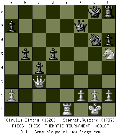Last move : 0-1 2013 December 10 21:15:30 [Event "FICGS__CHESS__THEMATIC_TOURNAMENT__000167"] [Site "FICGS"] [Date "2013.08.05"] [Round "1"] [White "Cirulis,Ilmars"] [Black "Sternik,Ryszard"] [Result "0-1"] [WhiteElo "1628"] [BlackElo "1787"] 1.e4 e5 2.Nf3 Nc6 3.Bc4 Bc5 4.b4 Bxb4 5.c3 Ba5 6.d4 exd4 7.O-O dxc3 8.Qb3 Qf6 9.Bg5 Qg6 10.Nxc3 Nf6 11.e5 d5 12.exf6 dxc4 13.fxg7 Qxg7 14.Rae1+ Kf8 15.Qa3+ Bb4 16.Be7+ Bxe7 17.Rxe7 Nxe7 18.Nd5 f6 19.Re1 Bh3 20.Ng5 Re8 21.Nxh3 Qf7 22.Nhf4 c6 23.Ne6+ Kg8 24.Nec7 cxd5 25.Nxe8 Ng6 26.Qf3 h6 27.Nxf6+ Kg7 28.Nh5+ Kg8 29.Qc3 b5 0-1 Evans gambit : compromised defense Kingside Castling by player White (move 7) Player Black won this chess game. Follow this game move after move (download)Pawns are born free, yet they are everywhere in chains. (Rick Kennedy) Obwohl ich vom Stil her kaum zu den Priestern der Schachkunst gezählt werde, halte ich Schach doch für eine Kunst. (Tigran Petrosjan) Durante una competencia de Ajedrez, un Maestro de Ajedrez deberá ser una combinación de presa de caza y un Monge. (Alexander Alekhine) La menace est plus forte que l'exécution. (Aaron Nimzovitch) Humor is by far the most significant activity of the human brain. (Edward De Bono)