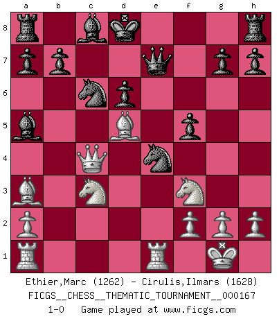 Last move : 1-0 2013 December 11 21:16:46 [Event "FICGS__CHESS__THEMATIC_TOURNAMENT__000167"] [Site "FICGS"] [Date "2013.08.05"] [Round "1"] [White "Ethier,Marc"] [Black "Cirulis,Ilmars"] [Result "1-0"] [WhiteElo "1262"] [BlackElo "1628"] 1.e4 e5 2.Nf3 Nc6 3.Bc4 Bc5 4.b4 Bxb4 5.c3 Ba5 6.d4 exd4 7.O-O Nf6 8.Ba3 d6 9.e5 Ne4 10.exd6 cxd6 11.Qe2 Qe7 12.Re1 f5 13.Bd5 dxc3 14.Qc4 Kd8 15.Nxc3 1-0 Evans gambit Kingside Castling by player White (move 7) Player White won this chess game. Follow this game move after move (download)Blessed be the memory of him who gave the world this immortal game. (A. G. Gardiner) Wenn man heute mit 14 Jahren noch kein GM ist, kann man es vergessen. (Viswanathan Anand) Los asuntos humanos son como una partida de Ajedrez: solo aquellos que no lo toman seriamente, pueden ser llamados buenos jugadores. (Hung Tzu Ch'eng) Les ravages du H expliquent la différence de niveau entre Tal et Thal [Abergel]. Art is the only way to run away without leaving home. (Twyla Tharp)
