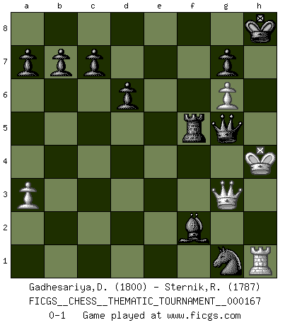 Last move : 0-1 2013 August 17 11:20:16 [Event "FICGS__CHESS__THEMATIC_TOURNAMENT__000167"] [Site "FICGS"] [Date "2013.08.05"] [Round "1"] [White "Gadhesariya,Divyesh"] [Black "Sternik,Ryszard"] [Result "0-1"] [WhiteElo "1800"] [BlackElo "1787"] 1.e4 e5 2.Nf3 Nc6 3.Bc4 Bc5 4.b4 Bxb4 5.c3 Ba5 6.d4 exd4 7.O-O dxc3 8.Qb3 Qf6 9.Bg5 Qg6 10.Nbxc3 Nf6 11.Bxf6 Qxf6 12.Ncd5 Qd8 13.a3 O-O 14.h4 d6 15.Nf4 Bb6 16.Ng5 Ne5 17.Nfe6 fxe6 18.Bxe6 Kh8 19.Bxc8 Qxc8 20.Kh1 Qg4 21.g3 h6 22.Kg2 hxg5 23.f3 Rxf3 24.Rxf3 Qxe4 25.hxg5 Qe2+ 26.Kh3 Nxf3 27.Rh1 Rf8 28.g6 Ng1+ 29.Kh4 Rf5 30.g4 Bf2+ 31.Qg3 Qe7+ 32.g5 Qxg5+ 0-1 Evans gambit : compromised defense Kingside Castling by player White (move 7) Kingside Castling by player Black (move 13) Player Black won this chess game. Follow this game move after move (download)Chess problems demand from the composer the same virtues that characterize all worthwhile art: originality, invention, conciseness, harmony, complexity, and splendid insincerity. (Vladimir Nabokov) Jeder weiß, dass Gasprom Putins persönliches Machtinstrument ist. Die Firma wird vom Kreml aus geleitet und wird schon deshalb nie transparent sein. (Garry Kasparov) Si pudieramos observar el interior de la cabeza de un jugador de Ajedrez, encontraríamos ahí un mundo lleno de sentimientos, imágenes, ideas, emoción y pasión. (Alfred Binet) Ne tendez aucun piège pour le plaisir ! Ne jouez rien dans l'espoir que l'adversaire réagisse de façon stupide ! Prenez toujours pour acquis que l'adversaire va trouver le meilleur coup ! Ne jouez jamais de coup dans l'espoir que l'adversaire ne voie pas la menace ! Chacun de vos coups doit améliorer la position d'une façon ou d'une autre. A good aphorism is too hard for the tooth of time, and is not worn away with the centuries, although it serves as food for every speech. (Friedrich Nietzsche)