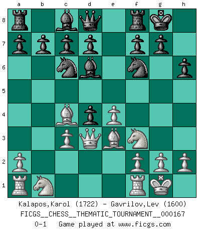 Last move : 0-1 2013 September 21 14:38:28 [Event "FICGS__CHESS__THEMATIC_TOURNAMENT__000167"] [Site "FICGS"] [Date "2013.08.05"] [Round "1"] [White "Kalapos,Karol"] [Black "Gavrilov,Lev"] [Result "0-1"] [WhiteElo "1722"] [BlackElo "1600"] 1.e4 e5 2.Nf3 Nc6 3.Bc4 Bc5 4.b4 Bxb4 5.c3 Bd6 6.O-O Nf6 7.d4 O-O 8.Qd3 h6 9.Be3 exd4 0-1 This chess game has been lost on time (started : 2013.08.05 3:55:8) Evans gambit : Stone-Ware variation Kingside Castling by player White (move 6) Kingside Castling by player Black (move 7) Player Black won this chess game. Follow this game move after move (download)If a ruler does not understand Chess, how can he rule over a kingdom ? (King Khusros II) Ein Remis kann durch Wiederholung von drei Zügen oder durch einen schlechte Zug erreicht werden. (Savielly Grigorievitsch Tartakower) Yo creo que el Ajedrez posee una magia que es también una ayuda en la edad avanzada. Una rodilla reumática es olvidada durante una partida de Ajedrez y otros eventos pueden parecer algo sin importancia comparada a una catástrofe en el tablero de Ajedrez. (Vlastimil Hort) Les échecs c'est le défi de l'alpiniste, toujours plus haut, prêt à tout pour monter à l'assaut du Roi ennemi. Les échecs, c'est de la musique en mouvement, un ballet majestueux pour les yeux. C'est de la poésie composée par les fantômes du passé qui au même titre que Rimbaud ou Verlaine méritent notre admiration. Les échecs, c'est de la peinture ou le moindre mouvement modifie le tableau pour en faire un Picasso ou un Van Gogh. Les échecs, c'est tout et rien, c'est la vie et la mort. Jjulie33 sur le forum de France-Echecs. After growing wildly for years, the field of computing appears to be reaching its infancy. (John Pierce)