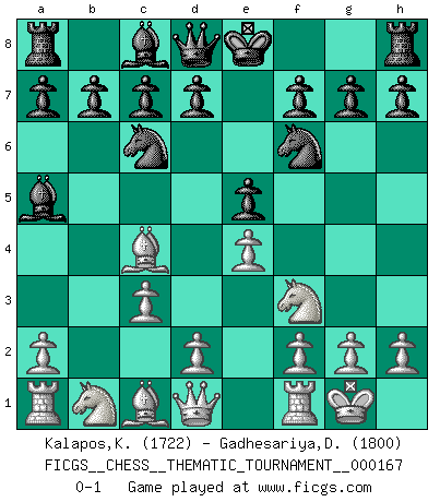 Last move : 0-1 2013 September 22 14:36:41 [Event "FICGS__CHESS__THEMATIC_TOURNAMENT__000167"] [Site "FICGS"] [Date "2013.08.05"] [Round "1"] [White "Kalapos,Karol"] [Black "Gadhesariya,Divyesh"] [Result "0-1"] [WhiteElo "1722"] [BlackElo "1800"] 1.e4 e5 2.Nf3 Nc6 3.Bc4 Bc5 4.b4 Bxb4 5.c3 Ba5 6.O-O Nf6 0-1 This chess game has been lost on time (started : 2013.08.05 3:55:8) Evans gambit Kingside Castling by player White (move 6) Player Black won this chess game. Follow this game move after move (download)All my games are real. (Bobby Fischer) Die Leute spielen gegen mich seit 15 Jahren unter Ihren Möglichkeiten. (Robert James Fischer) La última cosa en que Fischer estaba interesado era en tonterías, siempre y cuando el Ajedrez estuviera involucrado. (Elie Agur) Les échecs, c'est l'art d'analyser. (Mikhail Botvinnik) Chess is everything: art, science and sport. (Anatoly Karpov)