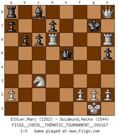 Last move : 1-0 2013 December 27 9:59:24 [Event "FICGS__CHESS__THEMATIC_TOURNAMENT__000167"] [Site "FICGS"] [Date "2013.08.05"] [Round "1"] [White "Ethier,Marc"] [Black "Goldmund,Heike"] [Result "1-0"] [WhiteElo "1262"] [BlackElo "1544"] 1.e4 e5 2.Nf3 Nc6 3.Bc4 Bc5 4.b4 Bxb4 5.c3 Be7 6.d4 exd4 7.Qb3 Na5 8.Bxf7+ Kf8 9.Qa4 Kxf7 10.Qxa5 Nf6 11.e5 Ne4 12.Qd5+ Kf8 13.Qxe4 dxc3 14.Nxc3 c6 15.O-O h6 16.Rd1 Qe8 17.Be3 Qf7 18.Nh4 Bxh4 19.Qxh4 Kg8 20.Rd6 b6 21.Rad1 g5 22.Bxg5 h5 23.Bh6 Rxh6 24.Rxh6 Qg7 25.R1d6 Qxe5 26.Qd8+ Kg7 27.Qh8+ 1-0 Evans gambit : 5...Be7 Kingside Castling by player White (move 15) Player White won this chess game. Follow this game move after move (download)Chess is a more highly symbolic game, but the aggressions are therefore even more frankly represented in the play. It probably began as a war game; that is, the representation of a miniature battle between the forces of two kingdoms. (Karl Meninger) Dieses schreckliche Gefühl, dass ich gegen eine Maschine spielte, die niemals Fehler macht, zerschmetterte meinen Widerstand. (Mark Taimanov) El jugador blanco perdió porque fallo en recordar la coreccta continuación y tuvo que pensar por sí mismo las movidas. (Siegbert Tarrasch) Je menace de comprendre la position. (Anonyme) The ultimate in disposing one's troops is to be without ascertainable shape. Then the most penetrating spies cannot pry in nor can the wise lay plans against you. (Sun Tzu)