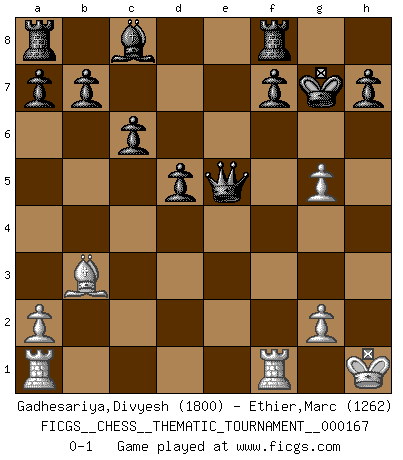 Last move : 0-1 2013 October 29 13:27:45 [Event "FICGS__CHESS__THEMATIC_TOURNAMENT__000167"] [Site "FICGS"] [Date "2013.08.05"] [Round "1"] [White "Gadhesariya,Divyesh"] [Black "Ethier,Marc"] [Result "0-1"] [WhiteElo "1800"] [BlackElo "1262"] 1.e4 e5 2.Nf3 Nc6 3.Bc4 Bc5 4.b4 Bxb4 5.O-O Nf6 6.c3 Be7 7.d4 Nxe4 8.Bd3 d5 9.Nxe5 Nxe5 10.dxe5 c6 11.Ba3 Bxa3 12.Nxa3 Nxc3 13.Qd2 Na4 14.f4 Nc5 15.Bc2 O-O 16.f5 Qb6 17.Kh1 Qb2 18.Qg5 Qxa3 19.f6 Ne6 20.h4 Nxg5 21.hxg5 Qc3 22.Bb3 Qxe5 23.fxg7 Kxg7 0-1 Evans gambit Kingside Castling by player White (move 5) Kingside Castling by player Black (move 15) Player Black won this chess game. Follow this game move after move (download)Fischer, who may or may not be mad as a hatter, has every right to be horrified. (Jeremy Silman) Ich glaube nicht an Psychologie, ich glaube an gute Züge. (Robert James Fischer) Bobby es la celebridad menos entendida y malinterpretada que camina el la faz de esta tierra. (Yasser Seirawan) J'ai vu le vaincu d'Echecs jouer des années durant dans l'espoir de la fête de la victoire. Car tu es plus riche de ce qu'elle existe si même elle n'est point pour toi. Ainsi de la perle du fond des mers. (Antoine de Saint-Exupéry) There are two major products that came out of Berkeley: LSD and UNIX. We do not believe this is to be a coincidence. (Jeremy S. Anderson)