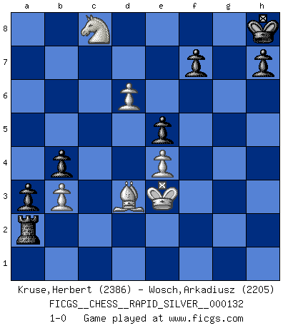 Last move : 1-0 2013 October 31 22:56:43 [Event "FICGS__CHESS__RAPID_SILVER__000132"] [Site "FICGS"] [Date "2013.08.09"] [Round "1"] [White "Kruse,Herbert"] [Black "Wosch,Arkadiusz"] [Result "1-0"] [WhiteElo "2386"] [BlackElo "2205"] 1.e4 e5 2.Nf3 Nc6 3.Bb5 a6 4.Ba4 Nf6 5.O-O Be7 6.Re1 b5 7.Bb3 d6 8.c3 O-O 9.h3 Na5 10.Bc2 c5 11.d4 Qc7 12.Nbd2 cxd4 13.cxd4 Nc6 14.Nb3 a5 15.Be3 a4 16.Nbd2 Bd7 17.Rc1 Qb7 18.Nf1 Rfe8 19.Ng3 Bd8 20.d5 Ne7 21.Nh4 Ba5 22.Bg5 Bxe1 23.Qxe1 Ng6 24.Qd2 Nf4 25.Bxf6 gxf6 26.Ngf5 Qb6 27.g3 Nxh3+ 28.Kg2 Ng5 29.f4 exf4 30.gxf4 Kh8 31.Qc3 Qd8 32.fxg5 Rg8 33.Kf3 Rxg5 34.Nh6 Qe7 35.Bd3 b4 36.Qd4 Rh5 37.N4f5 Bxf5 38.Nxf5 Qe5 39.Qxe5 fxe5 40.Nxd6 a3 41.b3 Rh3+ 42.Ke2 Rf8 43.Rc8 Rxc8 44.Nxc8 Rh2+ 45.Ke3 Rxa2 46.d6 1-0 Ruy Lopez : Closed Kingside Castling by player White (move 5) Kingside Castling by player Black (move 8) Player White won this chess game. Follow this game move after move (download)The older I grow, the more I value Pawns. (Keres) Ich würde die 30 stärksten Spieler der USA im Simultanspiel besiegen. (José Raúl Capablanca) Un mal plan es mejor que no tener ningún plan. (Frank Marshall) On a dit que l'homme se distingue de l'animal par le fait qu'il achète plus de livres qu'il ne peut en lire. Je voudrais suggérer qu'inclure à la liste des livres quelques livres d'échecs rendrait la distinction manifeste. (Edward Lasker) A government big enough to give you everything you want is strong enough to take everything you have. (Thomas Jefferson)
