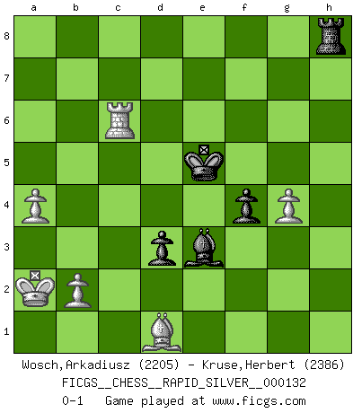 Last move : 0-1 2013 November 6 5:57:25 [Event "FICGS__CHESS__RAPID_SILVER__000132"] [Site "FICGS"] [Date "2013.08.09"] [Round "2"] [White "Wosch,Arkadiusz"] [Black "Kruse,Herbert"] [Result "0-1"] [WhiteElo "2205"] [BlackElo "2386"] 1.e4 c5 2.Nc3 d6 3.Nf3 Nf6 4.d4 cxd4 5.Nxd4 a6 6.Be3 e5 7.Nb3 Be6 8.f3 Be7 9.Qd2 O-O 10.O-O-O Nbd7 11.g4 b5 12.g5 Nh5 13.Nd5 Bxd5 14.exd5 f6 15.gxf6 Bxf6 16.Na5 Nf4 17.Nc6 Qc7 18.Rg1 Nb6 19.c3 Rae8 20.Bxf4 exf4 21.Bd3 Re3 22.Qc2 h6 23.Kb1 Nxd5 24.Be4 Nb6 25.Nb4 a5 26.Nd5 Nxd5 27.Rxd5 b4 28.cxb4 Qxc2+ 29.Bxc2 axb4 30.Bd1 Be5 31.Rb5 Rc8 32.Rxb4 Rd3 33.Re4 Kf7 34.Re2 Kf6 35.Rf1 d5 36.Bb3 Re3 37.Rd2 d4 38.Bc2 g5 39.h3 Rd8 40.Bd3 Bc7 41.Rc1 Ba5 42.Rc6+ Ke5 43.Re2 Rxe2 44.Bxe2 d3 45.Bd1 Bd2 46.a3 h5 47.a4 g4 48.fxg4 hxg4 49.hxg4 Rh8 50.Ka2 Be3 0-1 Sicilian : Closed Kingside Castling by player Black (move 9) Queenside Castling by player White (move 10) Player Black won this chess game. Follow this game move after move (download)Combinations have always been the most intriguing aspect of Chess. The masters look for them, the public applauds them, the critics praise them. It is because combinations are possible that Chess is more than a lifeless mathematical exercise. They are the poetry of the game; they are to Chess what melody is to music. They represent the triumph of mind over matter. (Reuben Fine) Schach ist wie eine schöne Frau, zu der wir ständig zurückkehren, gleichviel, wie oft sie uns zurückweist. (Anonymous) El arma más poderosa en el Ajedrez, es tener la próxima movida. (David Bronstein) Soyez une menace à chaque fois que vous vous asseyez pour jouer. (Ken Smith) Memory is a complicated thing, a relative to truth, but not its twin. (Barbara Kingsolver, Animal Dreams)