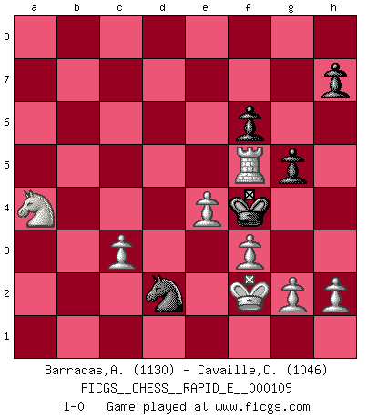 Last move : 1-0 2013 August 15 14:28:58 [Event "FICGS__CHESS__RAPID_E__000109"] [Site "FICGS"] [Date "2013.08.10"] [Round "1"] [White "Barradas,Anderson"] [Black "Cavaille,Cedric"] [Result "1-0"] [WhiteElo "1130"] [BlackElo "1046"] 1.e4 e5 2.Nf3 Nc6 3.Bb5 Nge7 4.O-O a6 5.Bxc6 Nxc6 6.c3 Bd6 7.d3 b5 8.b4 O-O 9.Nbd2 Be7 10.a4 bxa4 11.Rxa4 Bb7 12.Nc4 Nb8 13.Nfxe5 d6 14.Nf3 c5 15.Na5 Qc7 16.Re1 Nc6 17.Nxb7 Qxb7 18.bxc5 dxc5 19.Be3 Rfd8 20.Rc4 Qb5 21.Ra4 Qxd3 22.Qxd3 Rxd3 23.Rc4 f6 24.Bxc5 Bxc5 25.Rxc5 Ne7 26.Nd4 Rc8 27.Rxc8+ Nxc8 28.Rc1 Nd6 29.f3 Nc4 30.Nc6 a5 31.Kf1 a4 32.Nb4 Kf7 33.Nxd3 Ke6 34.Nc5+ Kd6 35.Nxa4 g5 36.Rd1+ Ke5 37.Rd5+ Kf4 38.Kf2 Nd2 39.Rf5+ 1-0 Ruy Lopez : Cozio defense Kingside Castling by player White (move 4) Kingside Castling by player Black (move 8) Player White won this chess game. Follow this game move after move (download)No other master has such a terrific will to win. At the board he radiates danger, and even the strongest opponents tend to freeze, like rabbits when they smell a panther. Even his weaknesses are dangerous. As white, his opening game is predictable - you can make plans against it - but so strong that your plans almost never work. In the middle game his precision and invention are fabulous, and in the end game you simply cannot beat him. (Anonymous German Expert) Wenn du nicht weißt was du tun sollst, warte bis dein Gegner eine Idee hat. Sie wird sicher schlecht sein. (Siegbert Tarrasch) La mitad de las variaciones que son calculadas en una partida de torneo, resultan ser completamente superfluas. Desafortunadamente, nadie sabe por adelantado cual mitad. (Jan Tinman) Même si vous avez un bon coup à faire, regardez toujours s'il n'y en a pas un qui lui soit préférable. (Pedro Damiano) If only people were all showed a certain minimum level of niceness; if only people didn't retract verbal draw offers (without draw box ticked) on ficgs; if only people didn't kill; if only people didn't run concentration / extermination camps, if only people didn't drop nuclear bombs on Hiroshima and Nagasaki, and so on - it would be a much more beautiful world. But sadly, things are not so... (Normajean Yates)