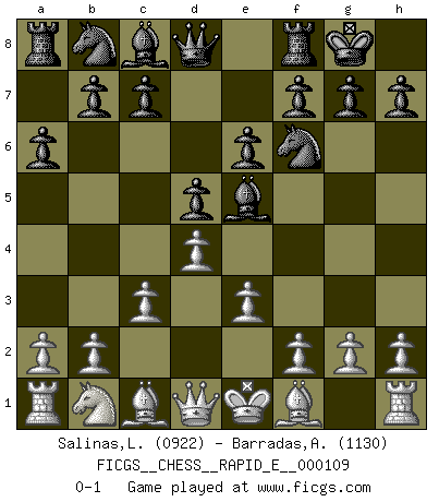 Last move : 0-1 2013 September 17 14:20:51 [Event "FICGS__CHESS__RAPID_E__000109"] [Site "FICGS"] [Date "2013.08.10"] [Round "1"] [White "Salinas,Loreva"] [Black "Barradas,Anderson"] [Result "0-1"] [WhiteElo "0922"] [BlackElo "1130"] 1.Nf3 d5 2.d4 Nf6 3.Ne5 e6 4.e3 a6 5.c3 Bd6 6.Ng4 O-O 7.Ne5 Bxe5 0-1 This chess game has been lost on time (started : 2013.08.10 12:13:6) Reti Opening Kingside Castling by player Black (move 6) Player Black won this chess game. Follow this game move after move (download)The game of chess is the touchstone of the intellect. (Goethe) Die Elozahlen sind sehr schlecht für das Schach. Jetzt ist Schach eine Sportindustrie, die darauf zielt Elopunkte zu machen. (Miguel Najdorf) Debemos de asegurarnos de que el Ajedrez no se convierta en un lenguaje muerto, muy interesante, pero solo para un grupo muy pequeño. (Sytze Faber) L'attaque fait le spectacle, la défense gagne les matchs. (Dicton footballistique) Gambling : The sure way of getting nothing from something. (Wilson Mizner)