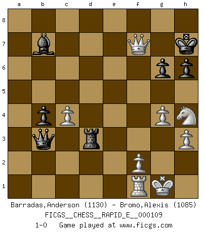 Last move : 1-0 2013 August 27 19:22:17 [Event "FICGS__CHESS__RAPID_E__000109"] [Site "FICGS"] [Date "2013.08.10"] [Round "1"] [White "Barradas,Anderson"] [Black "Bromo,Alexis"] [Result "1-0"] [WhiteElo "1130"] [BlackElo "1085"] 1.e4 e5 2.Nf3 Nc6 3.Bb5 d6 4.O-O Bd7 5.c3 Nf6 6.d3 a6 7.Bxc6 Bxc6 8.Bg5 Be7 9.Nbd2 h6 10.Bxf6 Bxf6 11.Nb3 Ba4 12.c4 O-O 13.Qd2 b6 14.Rac1 c5 15.Na1 Bd7 16.b3 b5 17.Nc2 b4 18.a3 a5 19.Ra1 Bg4 20.Nce1 Qb6 21.axb4 axb4 22.Rxa8 Rxa8 23.h3 Bh5 24.g4 Bg6 25.Ng2 Qd8 26.Nfe1 Ra3 27.Qc2 Qa8 28.Nf3 Bd8 29.Ngh4 Bxh4 30.Nxh4 Ra2 31.Qd1 Qa3 32.Qb1 Rb2 33.Qa1 Qxb3 34.Qa8+ Kh7 35.Qd5 Rd2 36.Qxd6 Rxd3 37.Qxc5 Bxe4 38.Qxe5 Bb7 39.Qf5+ g6 40.Qxf7+ 1-0 Ruy Lopez : Old Steinitz defense Kingside Castling by player White (move 4) Kingside Castling by player Black (move 12) Player White won this chess game. Follow this game move after move (download)Chess is imagination. (David Bronstein) Fischer: 'Remis!?' Uhlmann: 'Aber es muss doch dreimal Zugwiederholung sein!' Fischer: 'Sie nehmen das Remis an, wie ich es sage, sonst spiele ich weiter und werde Sie dann schlagen!' (Robert James Fischer) El muchacho (en ese entonces un niño de 12 años llamado Anatoly Karpov) no tiene ni idea de lo que es el Ajedrez y no hay futuro en absoluto para el en esta profesión. (Mikhail Botvinnik) Les réformistes prétendent que les progrès de la théorie conduiront à la disparition des échecs, et qu'il faut, pour leur rendre vie, en remanier les règles. En réalité, qu'exprime cette affirmation? Le mépris de l'intuition, de l'imagination et de tous les autres éléments qui font des échecs un art. (Alexander Alekhine) Logic : The art of thinking and reasoning in strict accordance with the limitations and incapacities of the human misunderstanding. (Ambrose Bierce)