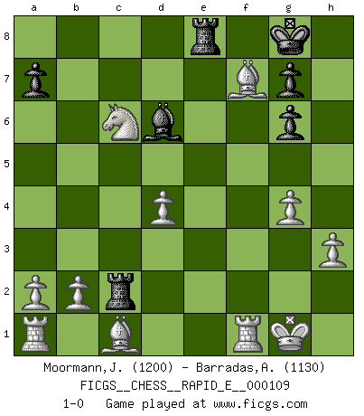 Last move : 1-0 2013 August 15 13:1:44 [Event "FICGS__CHESS__RAPID_E__000109"] [Site "FICGS"] [Date "2013.08.10"] [Round "1"] [White "Moormann,Joerg"] [Black "Barradas,Anderson"] [Result "1-0"] [WhiteElo "1200"] [BlackElo "1130"] 1.e4 e5 2.Nf3 Nf6 3.Nxe5 d6 4.Nf3 Nxe4 5.d4 d5 6.Bd3 Be7 7.O-O Bg4 8.h3 Bh5 9.c4 c6 10.cxd5 cxd5 11.Qb3 Nc6 12.Qxb7 Qc8 13.Ba6 Nd6 14.Qxc8+ Nxc8 15.Bb5 O-O 16.Bxc6 Rb8 17.g4 Bg6 18.Ne5 Nb6 19.Nc3 Rbc8 20.Nxd5 Nxd5 21.Bxd5 Rc2 22.f4 Rd8 23.Nc6 Re8 24.f5 Bd6 25.fxg6 hxg6 26.Bxf7+ 1-0 Petrov : Classical attack Kingside Castling by player White (move 7) Kingside Castling by player Black (move 15) Player White won this chess game. Follow this game move after move (download)Alekhine is a poet who creates a work of art out of something that would hardly inspire another man to send home a picture post card. (Max Euwe) Um dein Spiel zu verbessern musst du zuallererst das Endspiel studieren, denn diese kann unabhängig studiert werden. Die Eröffnung und das Mittelspiel müssen immer in Bezug gesetzt werden zum Endspiel. (José Raúl Capablanca) La última cosa en que Fischer estaba interesado era en tonterías, siempre y cuando el Ajedrez estuviera involucrado. (Elie Agur) La tactique est l'élément le plus important du milieu de jeu. (Siegbert Tarrasch) First of all, we have to go back to the classical time control. (Anatoly Karpov)