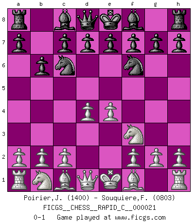 Last move : 0-1 2007 March 17 2:6:51 [Event "FICGS__CHESS__RAPID_C__000021"] [Site "FICGS"] [Date "2007.02.05"] [Round "1"] [White "Poirier,Jean Patrick"] [Black "Souquiere,Florence"] [Result "0-1"] [WhiteElo "1400"] [BlackElo "0803"] 1.e4 Nc6 2.Nf3 b6 3.d4 Nf6 0-1 This chess game has been lost on time (started : 2007.02.05 17:57:53) KP : Nimzovich defense Player Black won this chess game. Follow this game move after move (download)If your opponent offers you a draw, try to work out why he thinks he's worse off. (Nigel Short) Nach Morphy wurde nichts neues mehr in der Behandlung offener Positionen gefunden. (Mikhail Moiseyevich Botvinik) El Ajedrez es un expediente tonto que hace creer a la gente inactiva que hacen una cosa muy astuta cuando solamente estan perdiendo su tiempo. (George Bernard Shaw) Les échecs, c'est l'imagination. (David Bronstein) To err is human, to shift the blame on someone else is tactical. (Mladen Jankovic)
