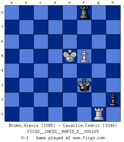 Last move : 0-1 2013 August 11 20:55:5 [Event "FICGS__CHESS__RAPID_E__000109"] [Site "FICGS"] [Date "2013.08.10"] [Round "1"] [White "Bromo,Alexis"] [Black "Cavaille,Cedric"] [Result "0-1"] [WhiteElo "1085"] [BlackElo "1046"] 1.d4 d5 2.c4 dxc4 3.Nc3 c6 4.e4 b5 5.Nf3 Nd7 6.b4 Qc7 7.g3 e5 8.dxe5 Bxb4 9.Bb2 Nxe5 10.Bg2 Bg4 11.h3 Nxf3+ 12.Bxf3 Bxf3 13.Qxf3 Nf6 14.a3 Bxc3+ 15.Bxc3 Qe7 16.e5 Nd5 17.O-O Nxc3 18.Qxc3 O-O 19.a4 a6 20.axb5 cxb5 21.Rfd1 Rfd8 22.Rxd8+ Qxd8 23.f4 Qd3 24.Qxd3 cxd3 25.Kf2 d2 26.Ke2 Rd8 27.Kd1 f6 28.exf6 gxf6 29.Rxa6 Rd3 30.Rxf6 b4 31.Rb6 b3 32.g4 Rxh3 33.Kxd2 Rh4 34.Rxb3 Rxg4 35.Rf3 Kf7 36.Ke3 h5 37.Ke4 Kf6 38.Rh3 h4 39.Rh2 Kg6 40.Ke5 Kh5 41.Kf5 Rg8 42.Kf6 Rf8+ 43.Ke5 Kg4 44.Rg2+ Kf3 45.Rg1 h3 46.f5 h2 0-1 Queen's gambit accepted Kingside Castling by player White (move 17) Kingside Castling by player Black (move 18) 10 pieces endgame at move 30 : White KRPPP , Black KRPPP WHITE : King + 1 Rook 3 Pawns BLACK : King + 1 Rook 3 Pawns 9 pieces endgame at move 32 : White KRPP , Black KRPPP WHITE : King + 1 Rook 2 Pawns BLACK : King + 1 Rook 3 Pawns 8 pieces endgame at move 33 : White KRPP , Black KRPP WHITE : King + 1 Rook 2 Pawns BLACK : King + 1 Rook 2 Pawns 7 pieces endgame at move 34 : White KRPP , Black KRP WHITE : King + 1 Rook 2 Pawns BLACK : King + 1 Rook 1 Pawn 6 pieces endgame at move 34 : White KRP , Black KRP WHITE : King + 1 Rook 1 Pawn BLACK : King + 1 Rook 1 Pawn Player Black won this chess game. Follow this game move after move (download)When I have White, I win because I am white; When I have Black, I win because I am Bogolyubov. (Bogolyubov) Die westlichen Werte sind eine Sprache, welche die Putin-Administration nicht versteht. (Garry Kasparov) El jugador táctico sabe que hacer cuando hay algo que hacer; mientras que el estratega sabe que hacer cuando no hay nada que hacer. (Gerald Abrahams) C'est la seule position que je connaisse où les deux camps sont mals. Propos prêtés à V. Anand. Depression is just anger without enthusiasm. (Unknown)