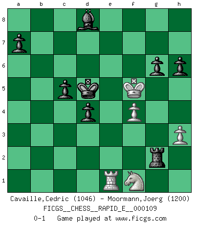 Last move : 0-1 2013 August 10 23:5:8 [Event "FICGS__CHESS__RAPID_E__000109"] [Site "FICGS"] [Date "2013.08.10"] [Round "1"] [White "Cavaille,Cedric"] [Black "Moormann,Joerg"] [Result "0-1"] [WhiteElo "1046"] [BlackElo "1200"] 1.e4 e5 2.Nf3 Nc6 3.d4 exd4 4.Nxd4 Nf6 5.Nxc6 bxc6 6.Bg5 h6 7.Bxf6 Qxf6 8.Bd3 Bc5 9.O-O Qxb2 10.Nd2 O-O 11.Qb1 Rb8 12.Qxb2 Rxb2 13.Rfb1 Rxb1+ 14.Rxb1 d6 15.Nc4 Re8 16.Na5 d5 17.exd5 cxd5 18.h3 Bb6 19.Nb3 c5 20.c4 d4 21.f3 Re3 22.Be4 Be6 23.Nd2 f5 24.Bd5 Bxd5 25.cxd5 Rc3 26.Kh2 Rc2 27.d6 Kf7 28.Nf1 Rxa2 29.Rc1 Ke6 30.Kg3 Kxd6 31.Kf4 Rxg2 32.Kxf5 Kd5 33.f4 Bd8 34.Re1 g6+ 0-1 Scotch : Schmidt variation Kingside Castling by player White (move 9) Kingside Castling by player Black (move 10) Player Black won this chess game. Follow this game move after move (download)A chess genius has died; a loss for humanity. (Viktor Kortchnoi, about Bobby Fischer's death) Karpov ist ein Museumsstück. (Garry Kasparov) La estratégia requiere pensar, la táctica requiere observación. (Max Euwe) Les échecs, c'est la lutte contre l'erreur. (Johannes Zukertort) As the days dwindle down... to a precious few. (Maxwell Anderson)