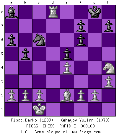 Last move : 1-0 2013 August 20 20:33:40 [Event "FICGS__CHESS__RAPID_E__000109"] [Site "FICGS"] [Date "2013.08.10"] [Round "1"] [White "Pipac,Darko"] [Black "Kehayov,Yulian"] [Result "1-0"] [WhiteElo "1289"] [BlackElo "1079"] 1.e4 c5 2.Nf3 a6 3.d4 cxd4 4.Qxd4 Nc6 5.Qc4 e5 6.Nc3 Nf6 7.Bg5 Be7 8.Bxf6 Bxf6 9.h3 O-O 10.Be2 b5 11.Qc5 Bb7 12.O-O-O Rc8 13.Qd6 Qe7 14.Qxd7 Qxd7 15.Rxd7 Rb8 16.Nd5 Rfd8 17.Nxf6+ gxf6 18.Rhd1 Rxd7 19.Rxd7 Ba8 20.Nh4 Rd8 21.Rxd8+ 1-0 Sicilian : O'Kelly variation Kingside Castling by player Black (move 9) Queenside Castling by player White (move 12) Player White won this chess game. Follow this game move after move (download)Chess is thirty to forty percent psychology. You don't have this when you play a computer. I can't confuse it. (Judith Polgar) Ich verstehe Aljechins Kombinationen ganz gut; aber woher er diese Angriffschancen bekommt und wie er die Eröffnung behandelt das ist für mich ein Buch mit sieben Siegeln. (Rudolf Spielmann) Evita las multitudes. Haz independientemente tu propio razonamiento. Trata de ser el jugador de Ajedrez, no la pieza de Ajedrez. (Ralph Charell) Toute estimation doit être constamment réévaluée. (Jacob Estrin) There is far too much law for those who can afford it and far too little for those who cannot. (Derek Bok)