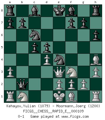 Last move : 0-1 2013 August 11 11:26:21 [Event "FICGS__CHESS__RAPID_E__000109"] [Site "FICGS"] [Date "2013.08.10"] [Round "1"] [White "Kehayov,Yulian"] [Black "Moormann,Joerg"] [Result "0-1"] [WhiteElo "1079"] [BlackElo "1200"] 1.d4 d5 2.c4 e6 3.cxd5 exd5 4.a3 c5 5.Nf3 Nc6 6.h3 Nf6 7.Bg5 Qb6 8.Qd2 Ne4 9.Qe3 h6 10.Bh4 Qxb2 0-1 Queen's gambit declined Player Black won this chess game. Follow this game move after move (download)Chess teaches you to control the initial excitement you feel when you see something that looks good and it trains you to think objectively when you're in trouble. (Stanley Kubrick) Ohne ihre Erfolge schmälern zu wollen würde ich sagen Petrosian, Spassky und Karpov verdanken ihre Siege ihren Trainern - Boleslavsky, Bondarevsky und Furman. (Mikhail Moiseyevich Botvinik) Desconfianza es la característica mas necesaria de un jugador de Ajedrez. (Siegbert Tarrasch) L'action d'une oeuvre littéraire se déroule sur un champ de bataille. Les masques et les types du drame moderne correspondent aux pièces du jeu d'échecs. L'intrigue correspond aux coups et aux gambits, c'est à dire aux techniques du jeu telles qu'utilisées et interprétées par les joueurs. Les tactiques et les péripéties [mouvements] correspondent aux coups exécutés par l'adversaire. (Viktor Shklovsky) When it is a question of money, everybody is of the same religion. (Voltaire)