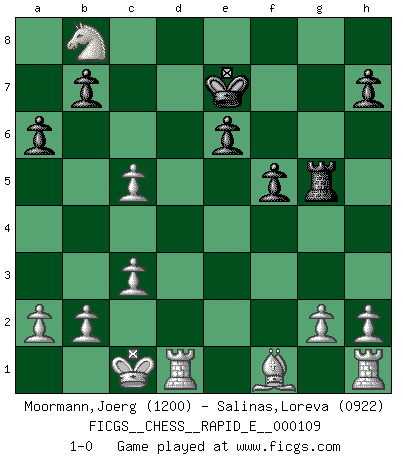 Last move : 1-0 2013 October 14 16:13:24 [Event "FICGS__CHESS__RAPID_E__000109"] [Site "FICGS"] [Date "2013.08.10"] [Round "1"] [White "Moormann,Joerg"] [Black "Salinas,Loreva"] [Result "1-0"] [WhiteElo "1200"] [BlackElo "0922"] 1.e4 e6 2.d4 Bb4+ 3.c3 Ba5 4.Qg4 d5 5.Qxg7 Qf6 6.Qxf6 Nxf6 7.e5 Ne4 8.f3 c5 9.fxe4 dxe4 10.dxc5 Nd7 11.Na3 Nxe5 12.Nb5 a6 13.Nd6+ Ke7 14.Nxe4 f5 15.Bg5+ Kf7 16.Nd6+ Kf8 17.Bf6 Rg8 18.Bxe5 Bc7 19.O-O-O Rg5 20.Nf3 Rg4 21.Nc4 Bxe5 22.Nfxe5 Rg5 23.Nb6 Rb8 24.Ned7+ Bxd7 25.Nxd7+ Ke7 26.Nxb8 1-0 This chess game has been lost on time (started : 2013.08.10 12:13:6) French defense Queenside Castling by player White (move 19) Player White won this chess game. Follow this game move after move (download)We must make sure that Chess will not be like a dead language, very interesting, but for a very small group. (Sytze Faber) Früher wurde jeder komplizierte Zug, jedes interessante Opfer mit großem Beifall und Enthusiasmus aufgenommen. Heute schaltet man einfach seinen Fritz an, und man kann sehen, was los ist, ob der Zug geht oder nicht. (Vladimir Kramnik) Uno por uno, yo los acribillé, mi superioridad muy pronto se volvio aparente. (Jose Capablanca) Les Echecs mettent en conflit, non pas deux intelligences, mais deux volontés. (Lasker) When you don't know what to do, walk fast and look worried. (Anonymous)