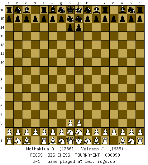 Last move : 0-1 2013 August 14 17:39:46 [Event "FICGS__BIG_CHESS__TOURNAMENT__000090"] [Site "FICGS"] [Date "2013.08.10"] [Round "1"] [White "Mathakiya,Azaz"] [Black "Velasco,Jose Maria"] [Result "0-1"] [WhiteElo "1386"] [BlackElo "1635"] 0-1 Follow this game move after move (download)Some sacrifices are sound; the rest are mine. (Mikhail Tal) Je älter ich werde, um so mehr schätze ich die Bauern. (Paul Keres) Cuando la partida de Ajedrez termina, el Peón y el Rey regresan a la misma caja. (Irish saying) Il a essayé de se convaincre qu'il pourrait empêcher toutes les erreurs et ne jamais perdre. L'horreur ! Gary Kasparov au sujet de Robert Fischer. Wisdom begins at the end. (Daniel Webster)