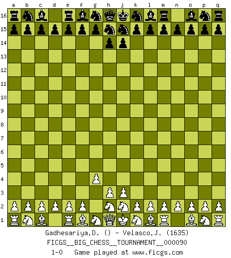 Last move : 1-0 2013 September 9 13:29:56 [Event "FICGS__BIG_CHESS__TOURNAMENT__000090"] [Site "FICGS"] [Date "2013.08.10"] [Round "1"] [White "Gadhesariya,Divyesh"] [Black "Velasco,Jose Maria"] [Result "1-0"] [WhiteElo ""] [BlackElo "1635"] 1.g2-g4 1-0 This big chess game has been lost on time (started : 2013.08.10 13:3:43) Follow this game move after move (download)One doesn't have to play well, it's enough to play better than your opponent. (Siegbert Tarrasch) Ich verlor meine Bürgerrechte, mein Gehalt wurde mir nicht mehr bezahlt und ich wurde zensiert und durfte nicht mehr ins Ausland reisen. [nach dem Match Fischer-Taimanov 6:0] (Mark Taimanov) Evita las multitudes. Haz independientemente tu propio razonamiento. Trata de ser el jugador de Ajedrez, no la pieza de Ajedrez. (Ralph Charell) Ne tendez aucun piège pour le plaisir ! Ne jouez rien dans l'espoir que l'adversaire réagisse de façon stupide ! Prenez toujours pour acquis que l'adversaire va trouver le meilleur coup ! Ne jouez jamais de coup dans l'espoir que l'adversaire ne voie pas la menace ! Chacun de vos coups doit améliorer la position d'une façon ou d'une autre. You must have a dream in order to have it come true. (A.P.J. Kalam)