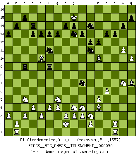 Last move : 1-0 2014 March 14 15:35:0 [Event "FICGS__BIG_CHESS__TOURNAMENT__000090"] [Site "FICGS"] [Date "2013.08.10"] [Round "1"] [White "Di Giandomenico,Alfonso"] [Black "Krakovsky,Peter"] [Result "1-0"] [WhiteElo ""] [BlackElo "1557"] 1.d2-d3 g15-g13 2.g2-g4 h16-c11 3.b1-c3 b15-b14 4.f1-g2 c16-b15 5.p1-o3 e15-e13 6.m2-m4 n15-n13 7.l1-m2 o16-f8 8.m2-f8 c11-f8 9.g1-f3 f16-a11 10.n2-n3 m15-m13 11.q1-p1 p16-o14 12.o1-n2 l16-q11 13.c3-e4 l15-l13 14.f3-g5 f15-f13 15.f2-f4 g16-f14 16.e2-e3 f8-h8 17.a1-b1 b15-l6 18.k1-l3 h8-h13 19.h2-j4 j15-k13 20.c1-d2 k16-l14 21.d2-c3 b16-c14 22.o3-n5 l6-j8 23.n2-o3 q11-o13 24.o3-j8 o13-j8 25.p2-p4 m13-m12 26.q2-q4 l13-l12 27.o2-o4 o14-n12 28.n3-n4 h15-j13 29.j2-k4 d15-d13 30.h1-p8 h13-h9 31.m4-m5 p15-p14 32.n5-l6 m16-m14 33.a2-a3 m14-o14 34.o4-o5 j8-m11 35.p8-a8 h9-f11 36.p4-p5 f14-e12 37.q4-q5 c14-d12 38.q5-q6 a15-a13 39.k4-h5 e16-e14 40.j1-h2 a11-c13 41.p1-q1 e14-c14 42.a8-a12 c13-b12 43.c3-h8 e12-c11 44.a12-a8 c11-e10 45.c2-c3 j16-j15 46.p5-p6 f11-f8 47.a8-f8 e10-f8 48.q6-q7 k13-l11 49.n4-n5 o14-o5 50.q1-o1 o5-o1 51.m1-o1 o15-o13 52.o1-o3 k15-k13 53.e1-o1 f8-g6 54.h8-m4 d12-f11 55.n5-n6 c14-c12 56.q7-q8 q16-d16 57.p6-p7 d16-d14 58.l6-n7 g6-j5 59.k2-k3 j5-k7 60.n7-o9 c12-c9 61.p7-p8 c9-c8 62.p8-p9 d14-c14 63.q8-q9 c14-c9 64.p9-p10 c8-d8 65.d3-d4 d8-d9 66.o9-p7 n12-o10 67.o3-o10 b12-j5 68.o10-o2 j5-n9 69.q9-q10 n9-m10 70.p10-p11 m11-q7 71.h5-k4 a16-d16 72.e4-c5 d16-d14 73.g2-b7 d9-f9 74.b7-e10 1-0 This big chess game has been lost on time (started : 2013.08.10 13:3:43) Follow this game move after move (download)Kasparov : J'adoube , Ivanchuk : S'il vous plaît ! (Garry Kasparov & Vassily Ivanchuk, Linares 1997) Die Jungen erwarten, dass Opa einfach umfällt. Dann aber kann Opa fünf Stunden lang Schach spielen und die jungen Gegner an die Wand drücken. (Viktor Kortschnoi) Estaba muy claro de que el punto vulnerable del Gran Maestro Americano (Bobby Fischer) radicaba en las posiciones de doble filo, colgantes, irracionales, donde el siempre falló en encontrar un triunfo aún en una posición de clara victoria. (Efim Geller) Ce qui est bien, c'est d'avoir tout un tas de pièces en prise : l'adversaire ne peut en prendre qu'une à la fois. Cité par Thierry Audin. Hardware: the parts of a computer that can be kicked. (Jeff Persis)