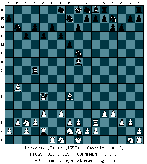 Last move : 1-0 2013 September 25 6:5:3 [Event "FICGS__BIG_CHESS__TOURNAMENT__000090"] [Site "FICGS"] [Date "2013.08.10"] [Round "1"] [White "Krakovsky,Peter"] [Black "Gavrilov,Lev"] [Result "1-0"] [WhiteElo "1557"] [BlackElo ""] 1.g2-g4 e15-e13 2.h1-d5 o15-o14 3.p2-p3 d15-d14 4.o1-p2 n15-n14 5.m2-m4 g15-g13 6.l1-q6 h14-h13 7.q6-f16 e16-f16 8.n2-n3 c16-k9 9.e2-e4 j15-k13 10.p2-b15 b16-d15 11.b15-a16 f16-a16 12.d5-h9 k9-p4 13.m1-m3 a16-d16 14.f1-a6 o16-d6 15.o2-o3 k13-j11 16.h9-e6 d6-h2 17.k1-h2 p4-o5 18.n3-n4 o5-l8 19.m3-l3 l8-g12 20.a6-b5 d16-b16 21.b5-f9 h16-f14 22.e6-j6 b16-b9 23.f9-d11 b9-b11 24.d2-d3 f14-f2 25.e1-e2 f2-f11 26.d11-c12 b11-b12 27.b1-c3 d15-b14 28.c12-f9 h13-h12 29.b2-b3 p16-n15 30.j6-c6 c15-c13 31.c1-h6 b12-b9 32.a1-f1 f15-f14 33.f9-d7 f11-b7 34.c6-e6 b9-d9 35.d7-c8 g12-j10 36.c8-b7 1-0 Follow this game move after move (download)Chess books should be used as we use glasses: to assist the sight, although some players make use of them as if they thought they conferred sight. (Jose Raul Capablanca) Wenn sie aufgeben, dann danke ich Ihnen für das Spiel (Eventualzug beim Fernschach). (Anonymous) Bobby solo arroja las piezas y solas caen en las casillas correctas. (Miguel Najdorf ) Vouloir jouer aux échecs contre soi-même est aussi paradoxal que vouloir marcher sur son ombre. (Stefan Zweig) Follow your passion, and success will follow you. (Arthur Buddhold)