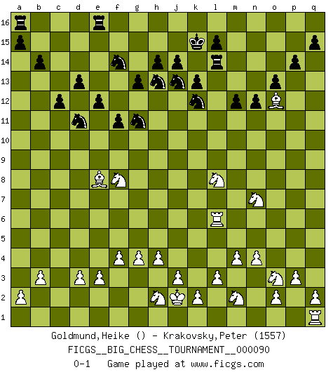 Last move : 0-1 2014 January 4 10:29:29 [Event "FICGS__BIG_CHESS__TOURNAMENT__000090"] [Site "FICGS"] [Date "2013.08.10"] [Round "1"] [White "Goldmund,Heike"] [Black "Krakovsky,Peter"] [Result "0-1"] [WhiteElo ""] [BlackElo "1557"] 1.g2-g4 g15-g13 2.f2-f4 p15-p14 3.b1-c3 o16-q14 4.e2-e3 b15-b14 5.p2-p3 c16-b15 6.o1-p2 b15-p2 7.p1-o3 p2-q1 8.m1-q1 h16-d12 9.m2-m4 n15-n13 10.b2-b3 m15-m14 11.l2-l3 l16-o13 12.h1-d5 d12-d5 13.c3-d5 o13-c2 14.d2-d3 q14-p15 15.d5-b4 n13-n12 16.b4-c2 p15-a1 17.c2-a1 p16-n15 18.c1-b2 q16-n16 19.e1-c1 c15-c13 20.b2-o14 k16-l14 21.j2-k4 m16-m15 22.g1-f3 n15-m13 23.o14-h8 d15-d13 24.a1-c2 e15-e13 25.c2-d4 f15-f13 26.l1-p5 c13-c12 27.k1-m2 f13-f12 28.h3-h4 j15-h13 29.f1-l6 e13-e12 30.f3-g5 b16-d15 31.l6-q11 o15-o13 32.d4-e6 f16-c13 33.h8-c13 d15-c13 34.n2-n4 m13-o14 35.p5-k10 o14-m13 36.q11-o9 m13-n11 37.o9-n8 h15-k14 38.n8-m7 m14-m13 39.m7-f13 j16-j15 40.j1-j2 k14-j12 41.k10-l9 n11-l12 42.e6-f8 j12-g11 43.f13-h11 l12-j13 44.h11-g10 m15-m14 45.g5-h7 k15-k13 46.c1-c6 l14-k12 47.l9-n11 m13-m12 48.n11-o12 m14-l14 49.c6-d6 g16-f14 50.h7-j9 l14-l8 51.j9-l8 j15-k15 52.k4-l6 n16-n14 53.l6-n7 n14-l14 54.d6-l6 f12-f11 55.g10-e8 c13-d11 0-1 This big chess game has been lost on time (started : 2013.08.10 13:3:43) Follow this game move after move (download)I have never in my life played the French Defence, which is the dullest of all openings. (Wilhelm Steinitz) Der beste Spieler in einem Turnier gewinnt es nie. Er landet auf Platz zwei oder drei. (Siegbert Tarrasch) El Ajedrez, como cualquier actividad creativa, solo puede existir a través del esfuerzo combinado de aquellos que tienen talento creativo y de aquellos que poseen la habilidad de organizar su trabajo creativo. (Mikhail Botvinnik) On entre au jeu d'Echecs comme on entre en Religion. Pour le joueur d'Echecs, la partie d'Echecs c'est l'office, la messe, le défilé du 1er Mai, le dépôt de gerbe au Monument aux Morts. C'est un drame sacré. (Michel Roos) Memory is a crazy woman that hoards colored rags and throws away food. (Austin O'Malley)