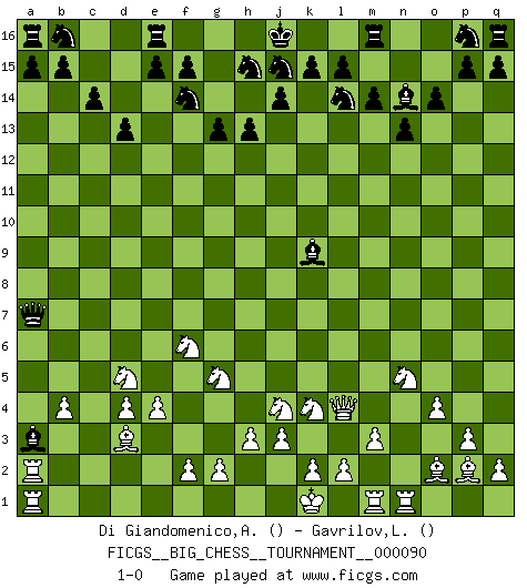 Last move : 1-0 2013 October 14 15:44:21 [Event "FICGS__BIG_CHESS__TOURNAMENT__000090"] [Site "FICGS"] [Date "2013.08.10"] [Round "1"] [White "Di Giandomenico,Alfonso"] [Black "Gavrilov,Lev"] [Result "1-0"] [WhiteElo ""] [BlackElo ""] 1.b2-b3 n15-n13 2.c1-b2 k16-l14 3.p2-p3 o16-g9 4.o2-o4 g15-g13 5.o1-p2 c15-c14 6.p1-o3 h16-d12 7.g1-f3 d12-c12 8.b1-c3 c12-n2 9.o3-q4 g9-b4 10.q1-n1 n2-h7 11.e2-e4 h7-f7 12.j2-k4 f7-e6 13.a2-a3 b4-c5 14.d2-d4 c5-e7 15.f1-c4 e6-k6 16.h2-g4 o15-o14 17.m2-m3 d15-d13 18.l1-n3 k6-k9 19.k1-h2 h14-h13 20.c3-d5 e7-f8 21.h1-l4 f16-k12 22.d5-f6 k12-j11 23.q4-p6 k9-k12 24.a3-a4 f8-a3 25.b2-a3 j11-a3 26.c2-c3 a3-b2 27.a1-b1 b2-c3 28.e1-c1 c3-b4 29.n3-o2 g16-f14 30.f6-d5 b4-a3 31.c1-c2 c16-k9 32.c4-d3 k12-k11 33.p6-n5 k11-m11 34.f3-g5 m15-m14 35.b3-b4 l16-n14 36.g4-f6 m11-a11 37.h2-j4 a11-a4 38.c2-a2 a4-a9 39.j1-k1 a9-a7 40.b1-a1 1-0 Follow this game move after move (download)I guess a certain amount of temperament is expected of Chess geniuses. (Ron Gross) Wie gewinnt Tal? Er entwickelt alle seine Figuren in die Brettmitte und opfert sie dann irgendwo. (Robert James Fischer) No volvere nunca a jugar contigo. Has insultado a mi amigo. - cuando un oponente se maldijo por una mala jugada (Miguel Najdorf) Je menace de comprendre la position. (Anonyme) Kids, you tried your best and you failed miserably. The lesson is, never try. (Simpsons)