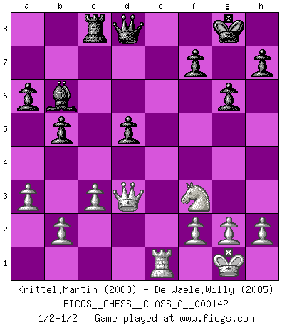 Last move : 1/2-1/2 2013 September 25 17:38:21 [Event "FICGS__CHESS__CLASS_A__000142"] [Site "FICGS"] [Date "2013.08.11"] [Round "1"] [White "Knittel,Martin"] [Black "De Waele,Willy"] [Result "1/2-1/2"] [WhiteElo "2000"] [BlackElo "2005"] 1.e4 c5 2.Nf3 d6 3.d4 cxd4 4.Nxd4 Nf6 5.Nc3 a6 6.Be3 e5 7.Nb3 Be6 8.Be2 Be7 9.O-O O-O 10.Qd3 Nc6 11.a3 Rc8 12.Nd5 Bxd5 13.exd5 e4 14.Qd2 Ne5 15.Rac1 Nc4 16.Bxc4 Rxc4 17.Qe2 b5 18.Nd2 Rc8 19.Bd4 Nxd5 20.Qxe4 Nc7 21.Nf3 Ne6 22.c3 d5 23.Qf5 g6 24.Qd3 Nxd4 25.Nxd4 Bc5 26.Rcd1 Re8 27.Nf3 Bb6 28.Rfe1 Rxe1+ 29.Rxe1 1/2-1/2 Sicilian : Najdorf, Byrne (English) attack Kingside Castling by player White (move 9) Kingside Castling by player Black (move 9) This chess game ended in a draw. Follow this game move after move (download)With or without the title, Bobby Fischer was unquestionably the greatest player of his time. (Burt Hochberg) Offener Brief an US-Präsident Bush anlässlich der Verhaftung Bobby Fishers: Verhaften Sie mich. Stecken Sie mich in dieselbe Zelle wie Bobby Fisher und geben Sie uns ein Schachspiel mit. (Boris Vassilievich Spassky) Existen dos clases de sacrificios: los correctos y los míos. (Mikhail Tal) Pour se monter efficace, un Cavalier a besoin d'avant-postes ! Les Cavaliers font les meilleurs bloqueurs de pions passés. Man with more than one clock never knows what time it is. (Chinese thought)